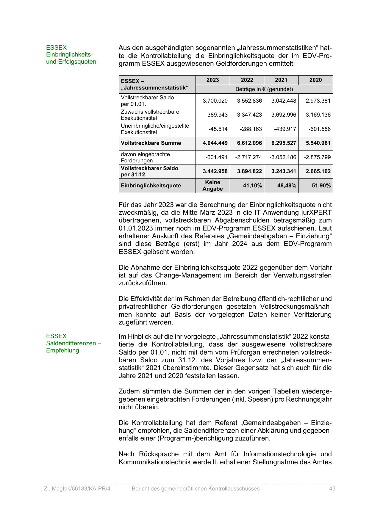 Aus den ausgehändigten sogenannten „Jahressummenstatistiken“ hatte die Kontrollabteilung die Einbringlichkeitsquote der im EDV-Programm ESSEX ausgewiesenen Geldforderungen ermittelt: