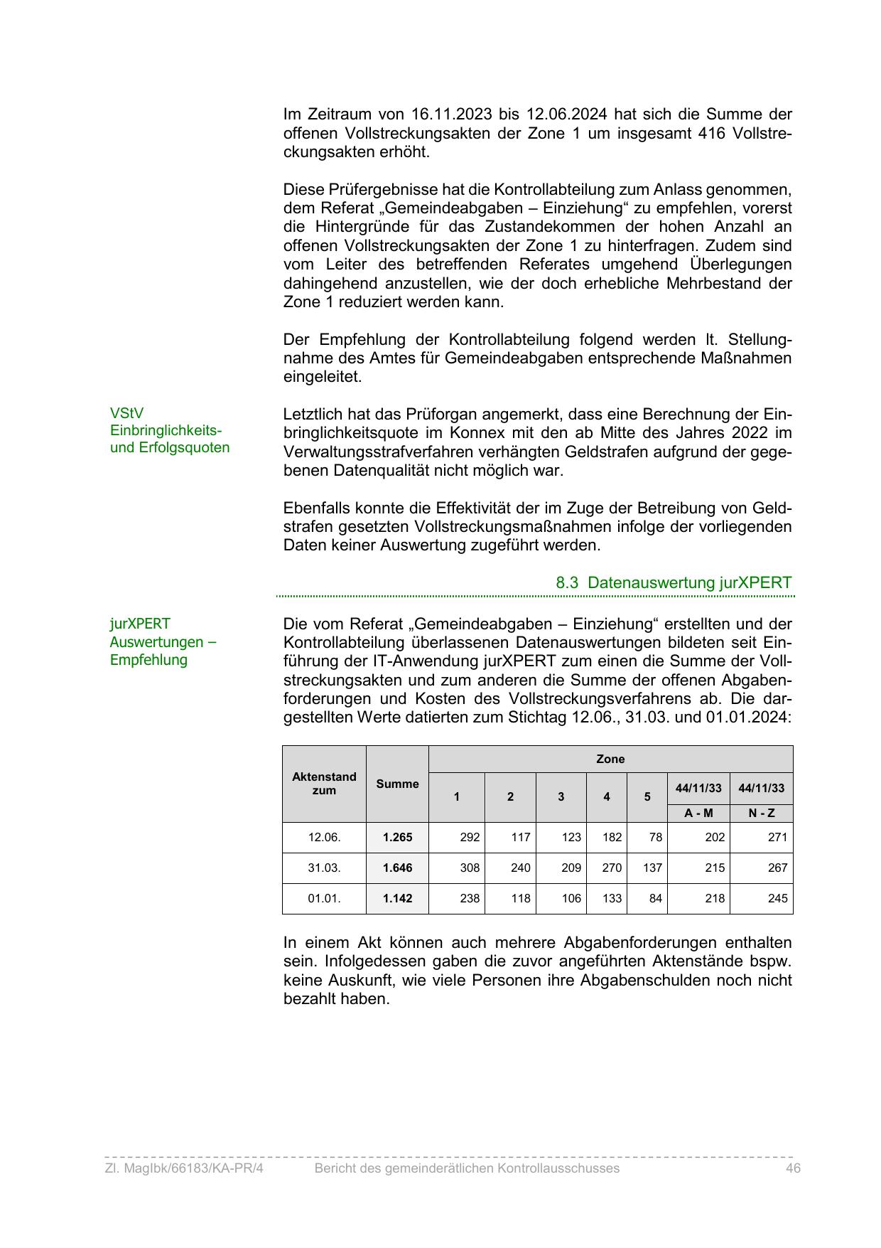 Kontrollabteilung überlassenen Datenauswertungen bildeten seit Einführung der IT-Anwendung jurXPERT zum einen die Summe der Vollstreckungsakten und zum anderen die Summe der offenen Abgabenforderungen und Kosten des Vollstreckungsverfahrens ab. Die dargestellten Werte datierten zum Stichtag 12.06., 31.03. und 01.01.2024: