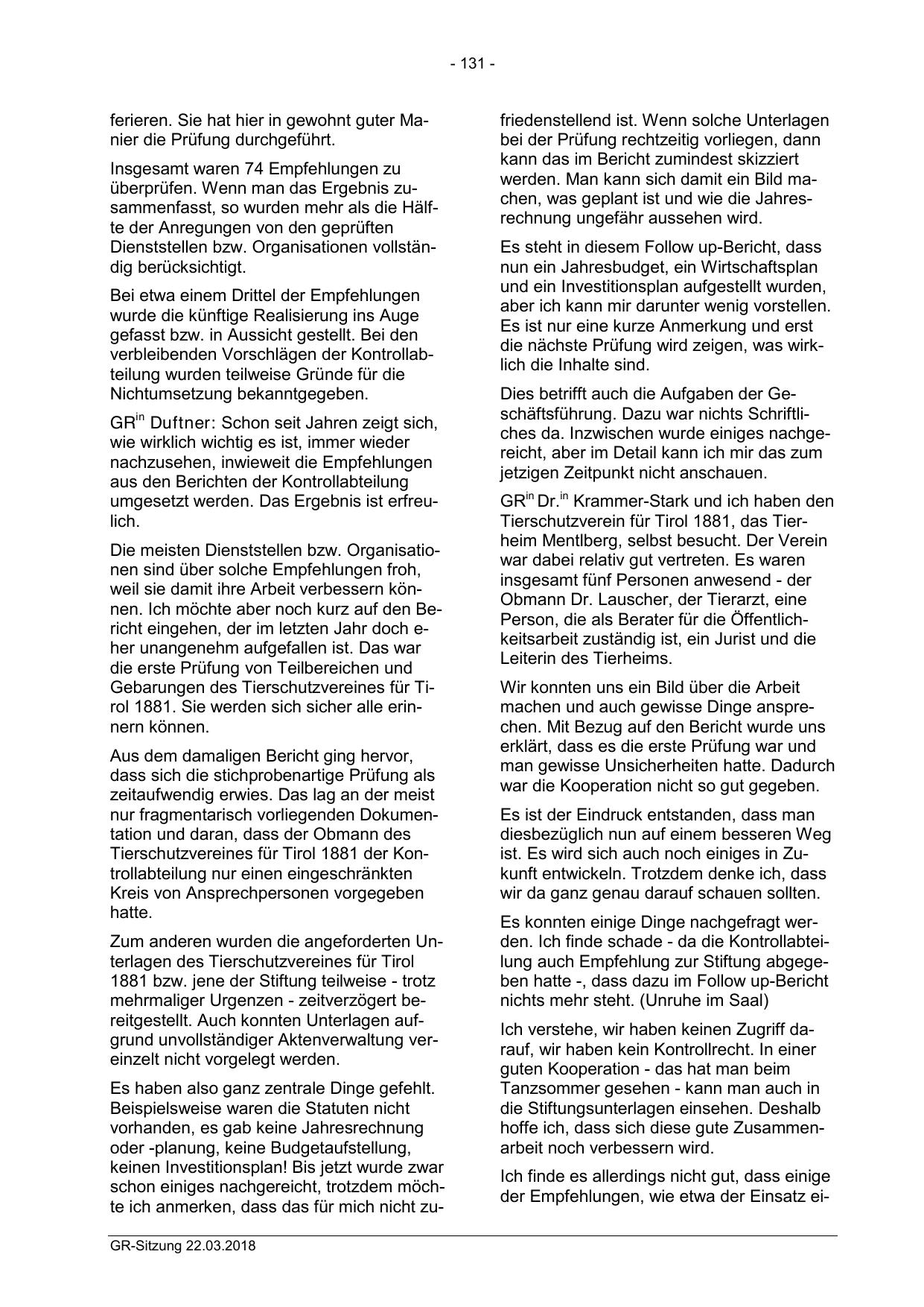 Es konnten einige Dinge nachgefragt werden. Ich finde schade - da die Kontrollabteilung auch Empfehlung zur Stiftung abgegeben hatte -, dass dazu im Follow up-Bericht