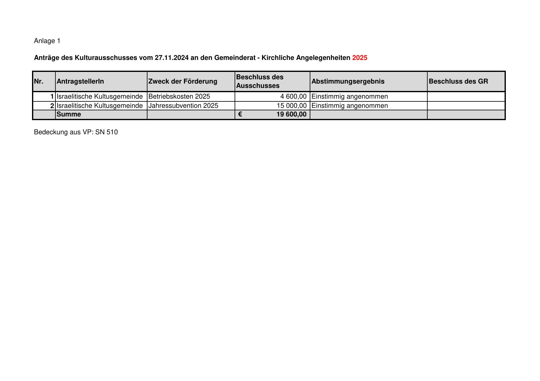 Anträge des Kulturausschusses vom 27.11.2024 an den Gemeinderat - Kirchliche Angelegenheiten 2025