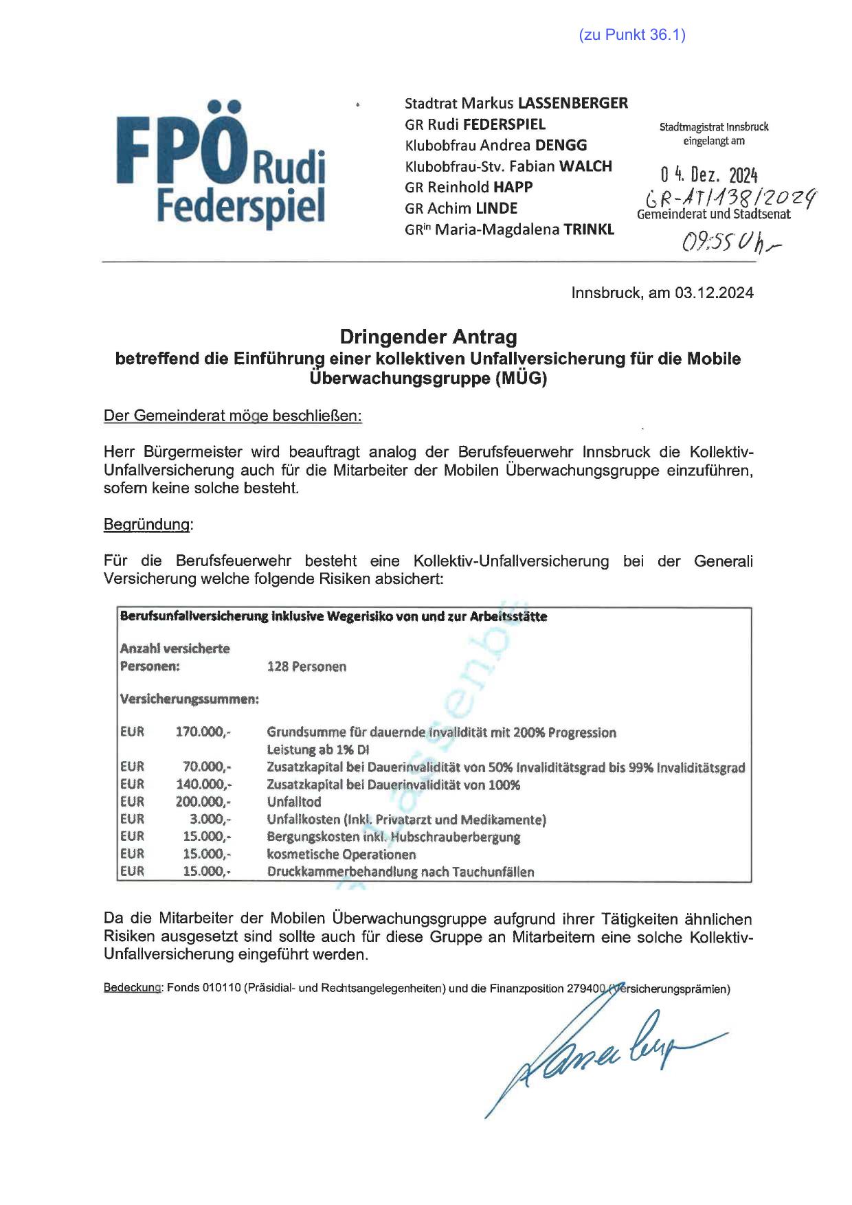 Herr Bürgermeister wird beauftragt analog der Berufsfeuerwehr Innsbruck die KollektivUnfallversicherung auch für die Mitarbeiter der Mobilen Überwachungsgruppe einzuführen,