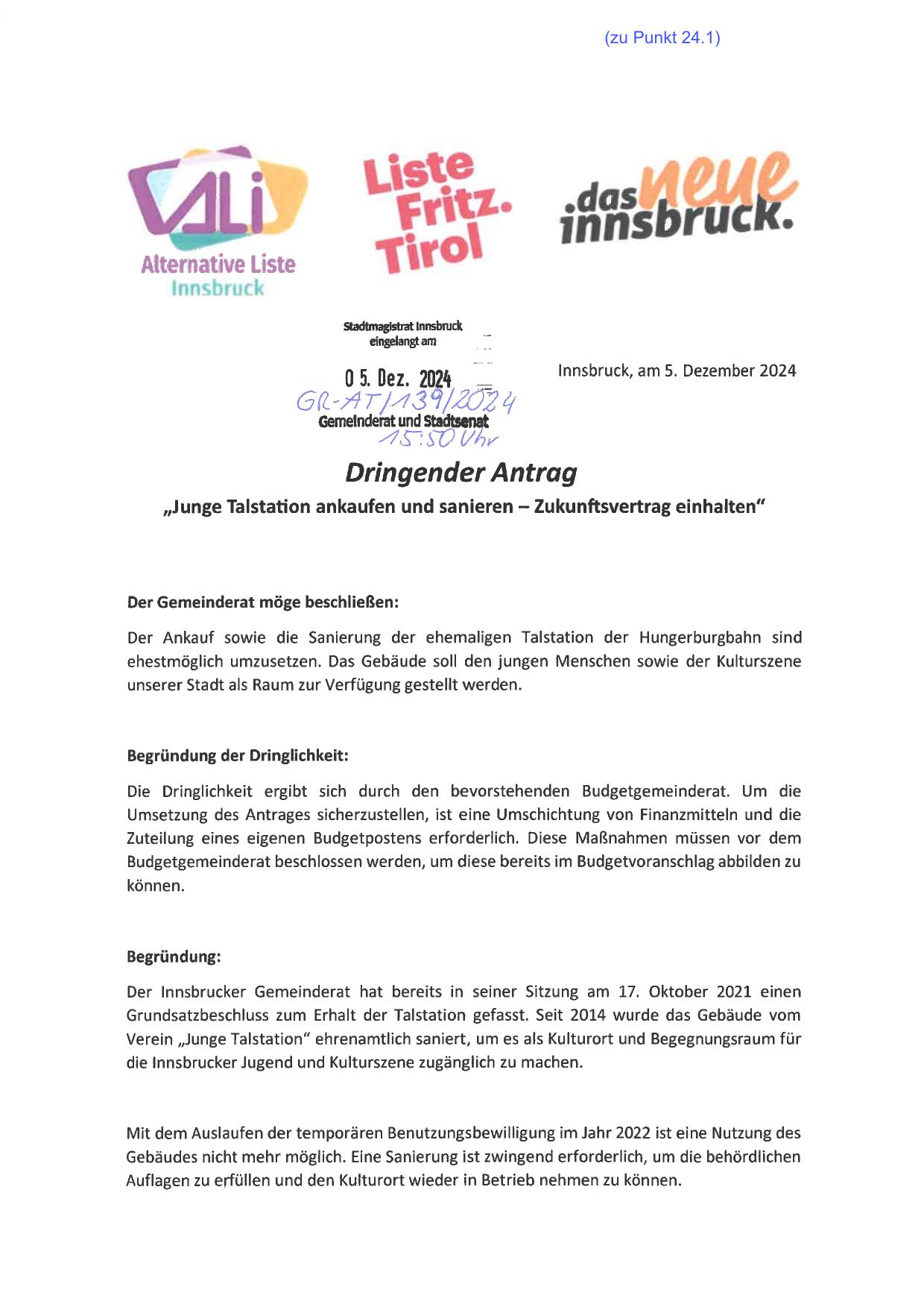 "Junge Talstation ankaufen und sanieren - Zukunftsvertrag einhalten"