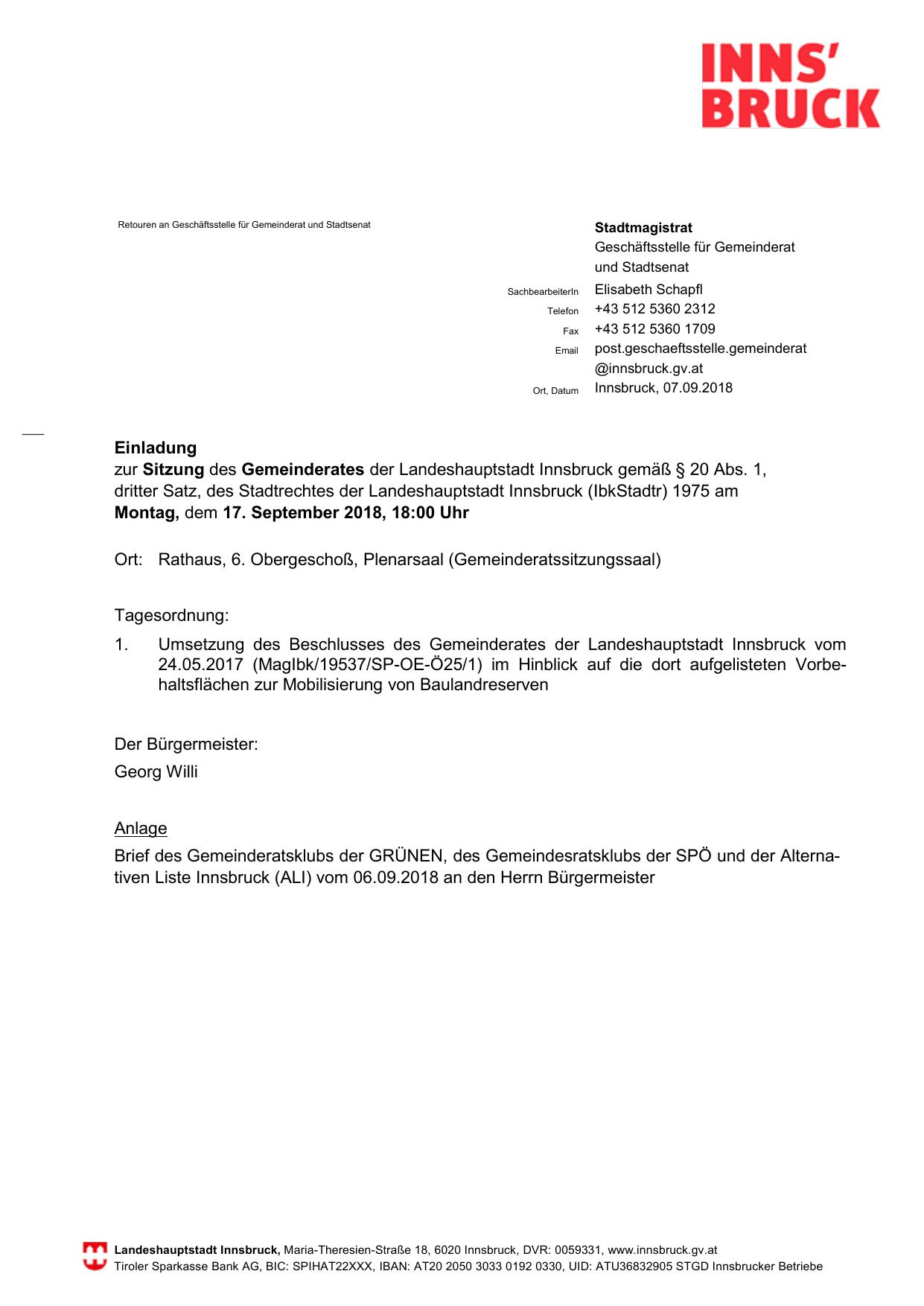 Brief des Gemeinderatsklubs der GRÜNEN, des Gemeindesratsklubs der SPÖ und der Alternativen Liste Innsbruck (ALI) vom 06.09.2018 an den Herrn Bürgermeister