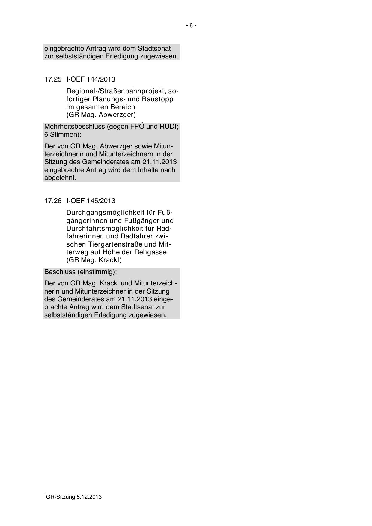 des Gemeinderates am 21.11.2013 eingebrachte Antrag wird dem Stadtsenat zur