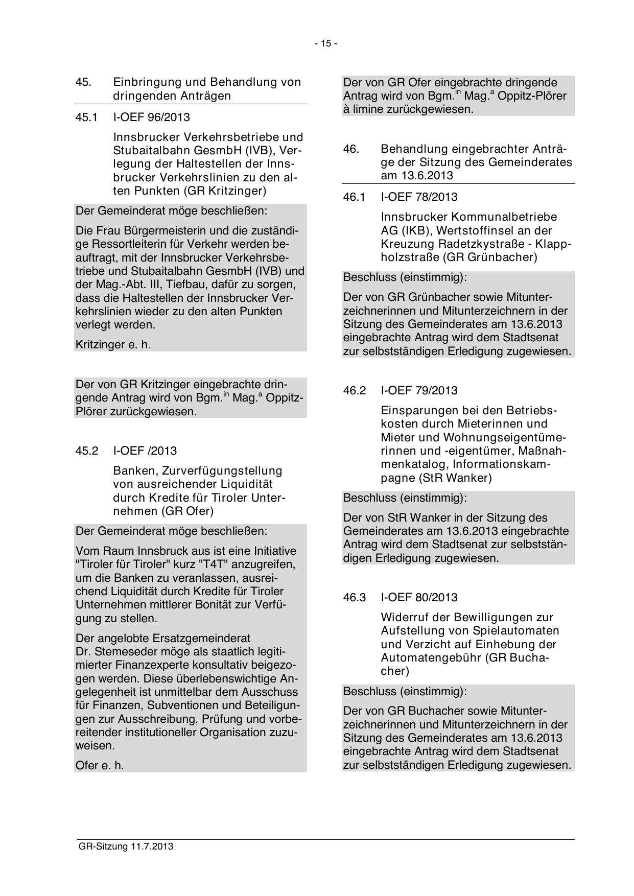 Die Frau Bürgermeisterin und die zuständige Ressortleiterin für Verkehr werden beauftragt, mit der Innsbrucker Verkehrsbetriebe und Stubaitalbahn GesmbH (IVB) und