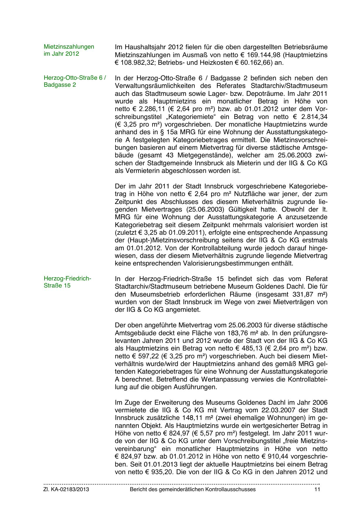 anhand des in § 15a MRG für eine Wohnung der Ausstattungskategorie A festgelegten Kategoriebetrages ermittelt. Die Mietzinsvorschreibungen basieren auf einem Mietvertrag für diverse städtische Amtsgebäude (gesamt 43 Mietgegenstände), welcher am 25.06.2003 zwischen der Stadtgemeinde Innsbruck als Mieterin und der IIG & Co KG