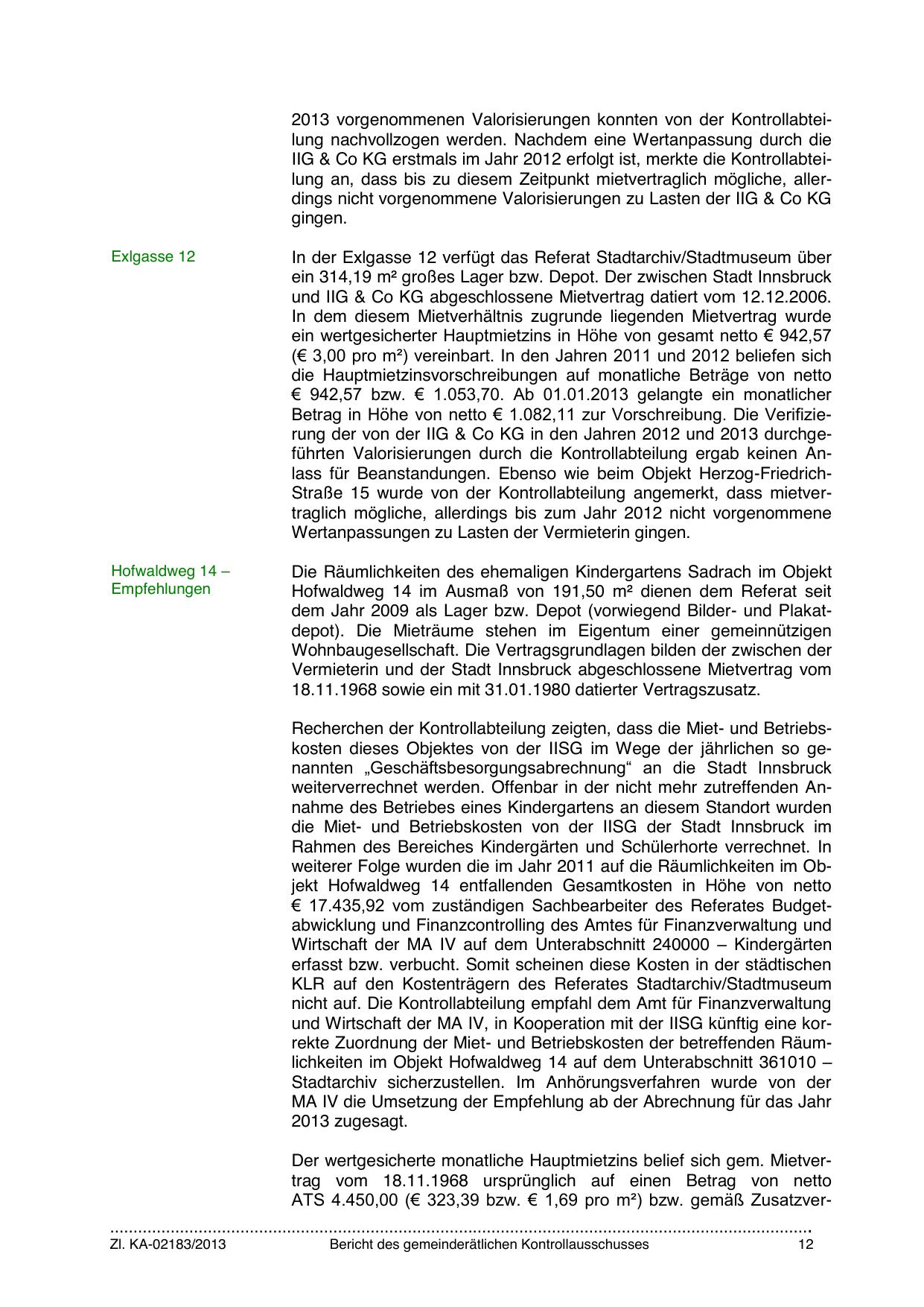 IIG & Co KG erstmals im Jahr 2012 erfolgt ist, merkte die Kontrollabteilung an, dass bis zu diesem Zeitpunkt mietvertraglich mögliche, allerdings nicht vorgenommene Valorisierungen zu Lasten der IIG & Co KG