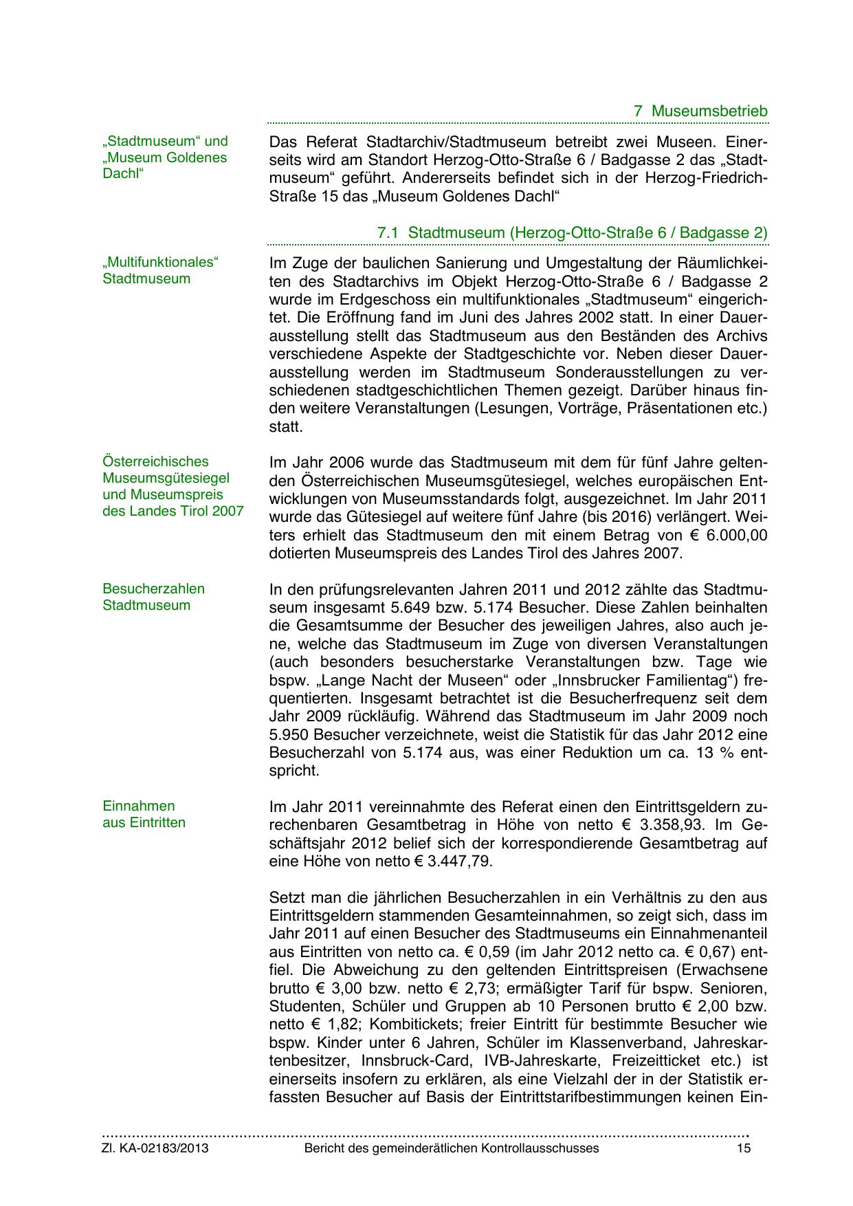 In den prüfungsrelevanten Jahren 2011 und 2012 zählte das Stadtmuseum insgesamt 5.649 bzw. 5.174 Besucher. Diese Zahlen beinhalten