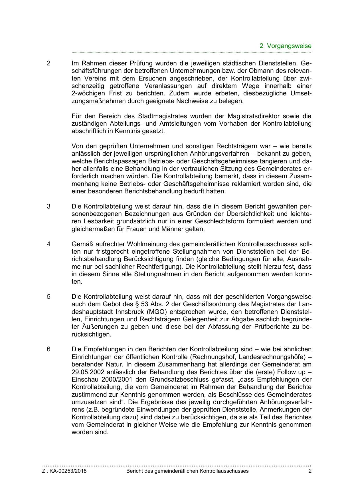 auch dem Gebot des § 53 Abs. 2 der Geschäftsordnung des Magistrates der Landeshauptstadt Innsbruck (MGO) entsprochen wurde, den betroffenen Dienststellen, Einrichtungen und Rechtsträgern Gelegenheit zur Abgabe sachlich begründeter Äußerungen zu geben und diese bei der Abfassung der Prüfberichte zu berücksichtigen.