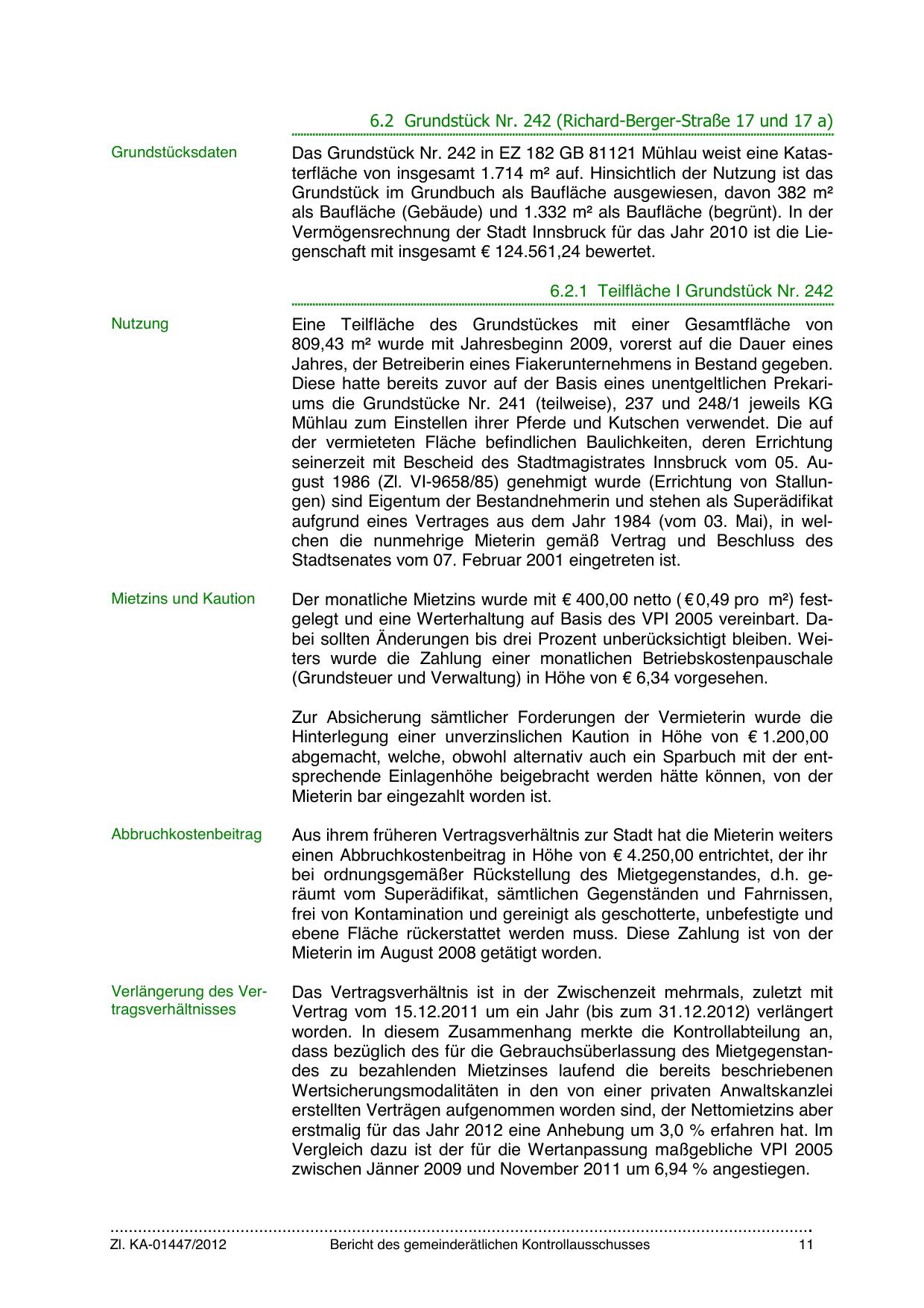 Vermögensrechnung der Stadt Innsbruck für das Jahr 2010 ist die Liegenschaft mit insgesamt € 124.561,24 bewertet.