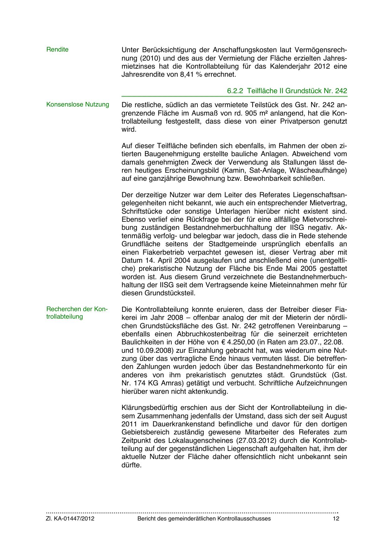 Unter Berücksichtigung der Anschaffungskosten laut Vermögensrechnung (2010) und des aus der Vermietung der Fläche erzielten Jahresmietzinses hat die Kontrollabteilung für das Kalenderjahr 2012 eine