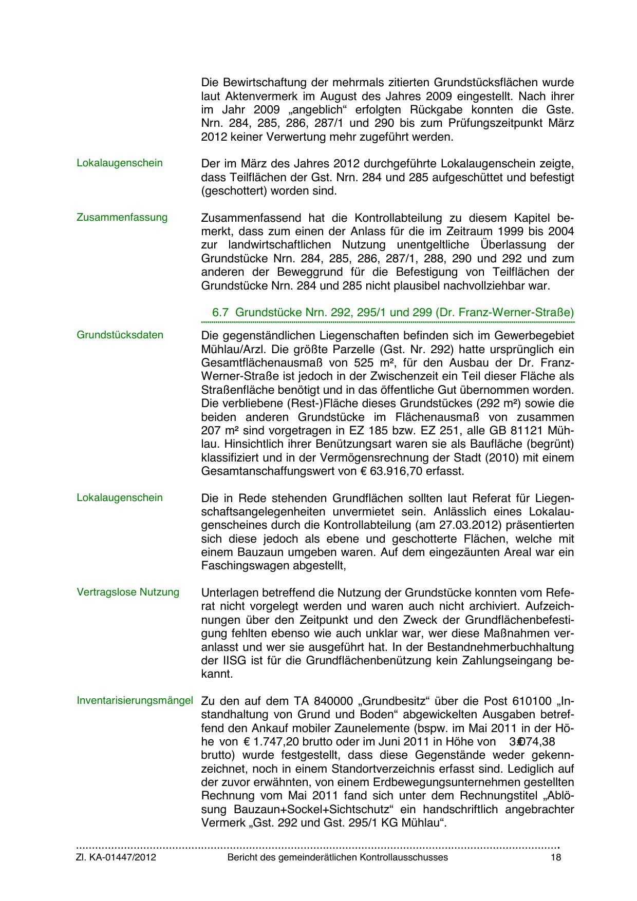 Unterlagen betreffend die Nutzung der Grundstücke konnten vom Referat nicht vorgelegt werden und waren auch nicht archiviert. Aufzeichnungen über den Zeitpunkt und den Zweck der Grundflächenbefestigung fehlten ebenso wie auch unklar war, wer diese Maßnahmen veranlasst und wer sie ausgeführt hat. In der Bestandnehmerbuchhaltung