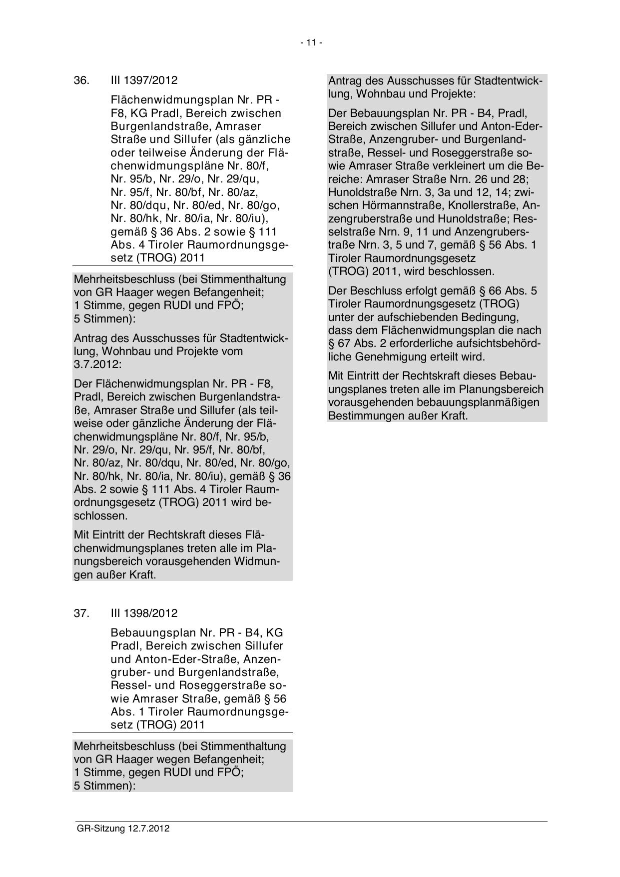 Pradl, Bereich zwischen Burgenlandstraße, Amraser Straße und Sillufer (als teilweise oder gänzliche Änderung der Flächenwidmungspläne Nr. 80/f, Nr. 95/b,