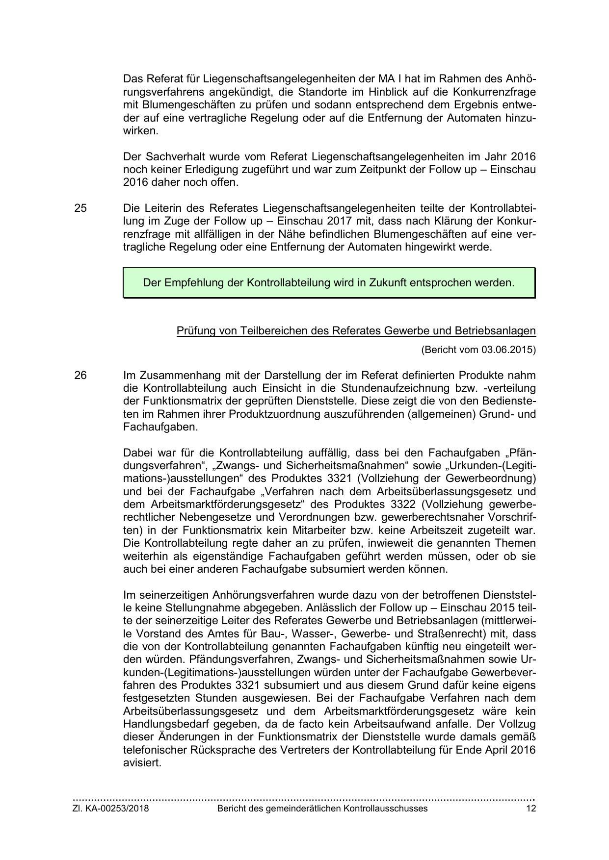 Die Leiterin des Referates Liegenschaftsangelegenheiten teilte der Kontrollabteilung im Zuge der Follow up – Einschau 2017 mit, dass nach Klärung der Konkurrenzfrage mit allfälligen in der Nähe befindlichen Blumengeschäften auf eine vertragliche Regelung oder eine Entfernung der Automaten hingewirkt werde.