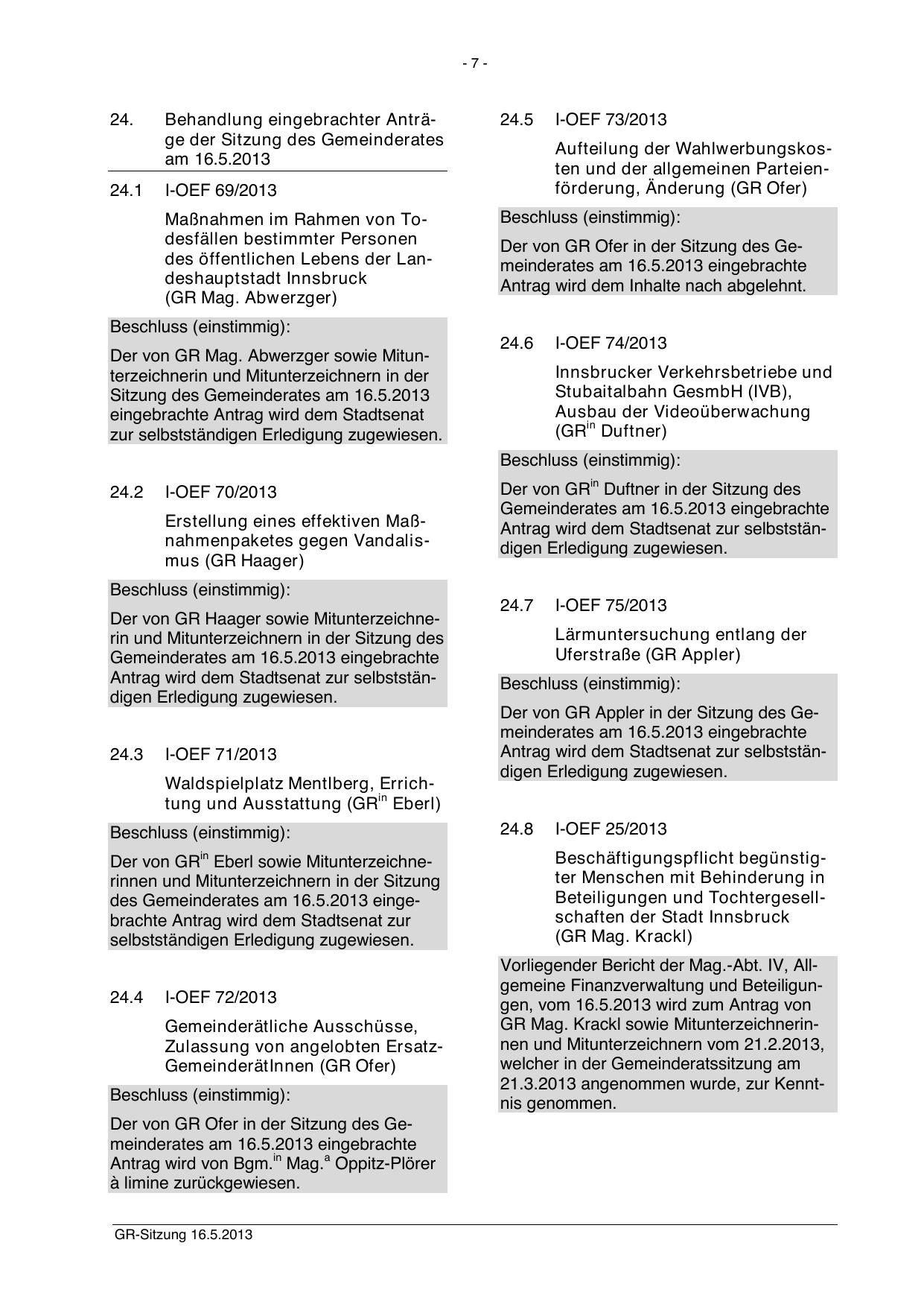Der von GR Ofer in der Sitzung des Gemeinderates am 16.5.2013 eingebrachte