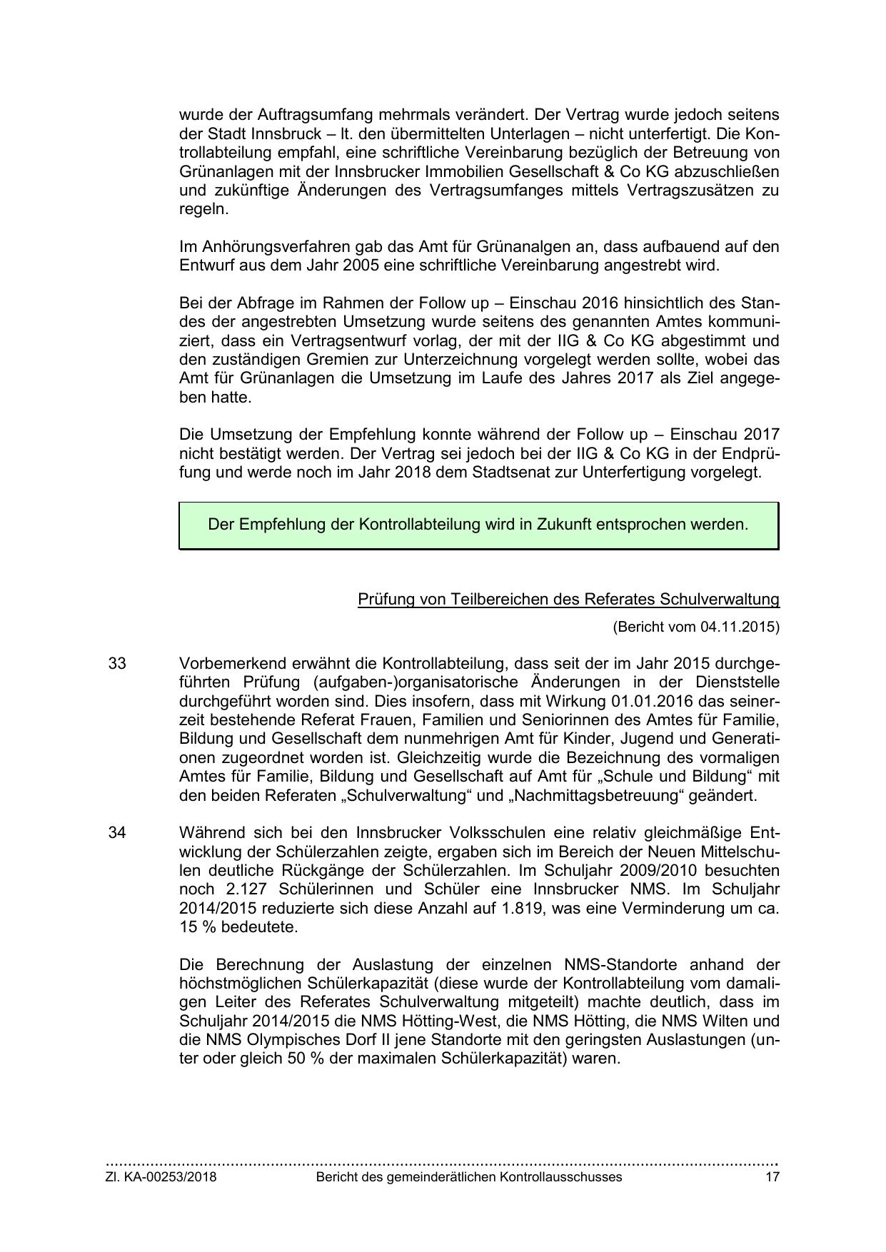 Bei der Abfrage im Rahmen der Follow up – Einschau 2016 hinsichtlich des Standes der angestrebten Umsetzung wurde seitens des genannten Amtes kommuniziert, dass ein Vertragsentwurf vorlag, der mit der IIG & Co KG abgestimmt und