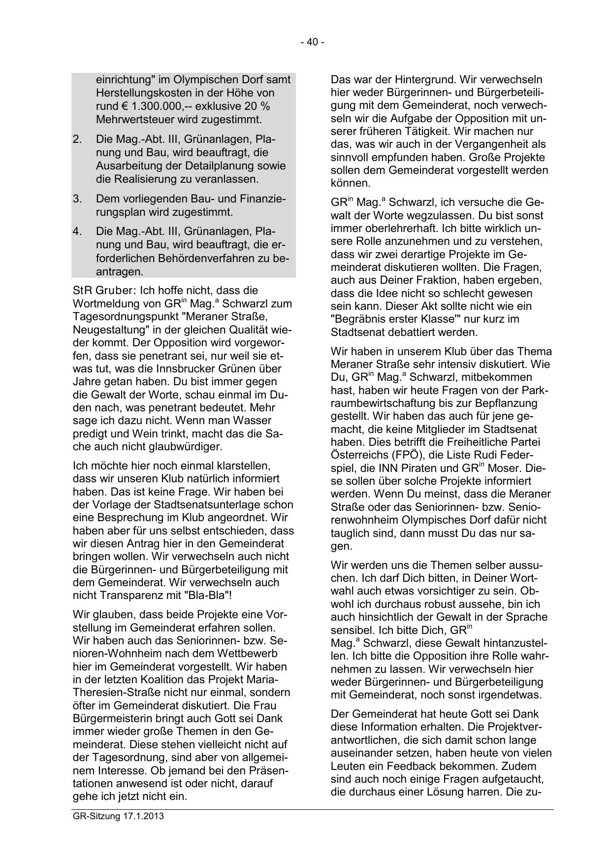 Neugestaltung" in der gleichen Qualität wieder kommt. Der Opposition wird vorgeworfen, dass sie penetrant sei, nur weil sie etwas tut, was die Innsbrucker Grünen über