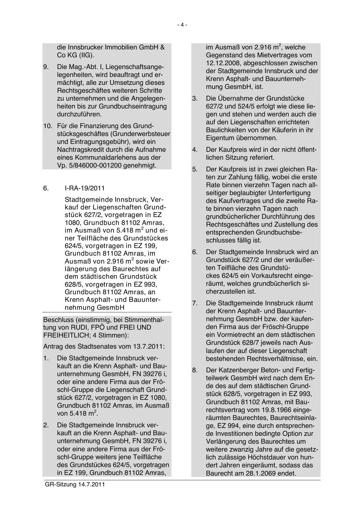 Die Stadtgemeinde Innsbruck verkauft an die Krenn Asphalt- und Bauunternehmung GesmbH, FN 39276 i,
