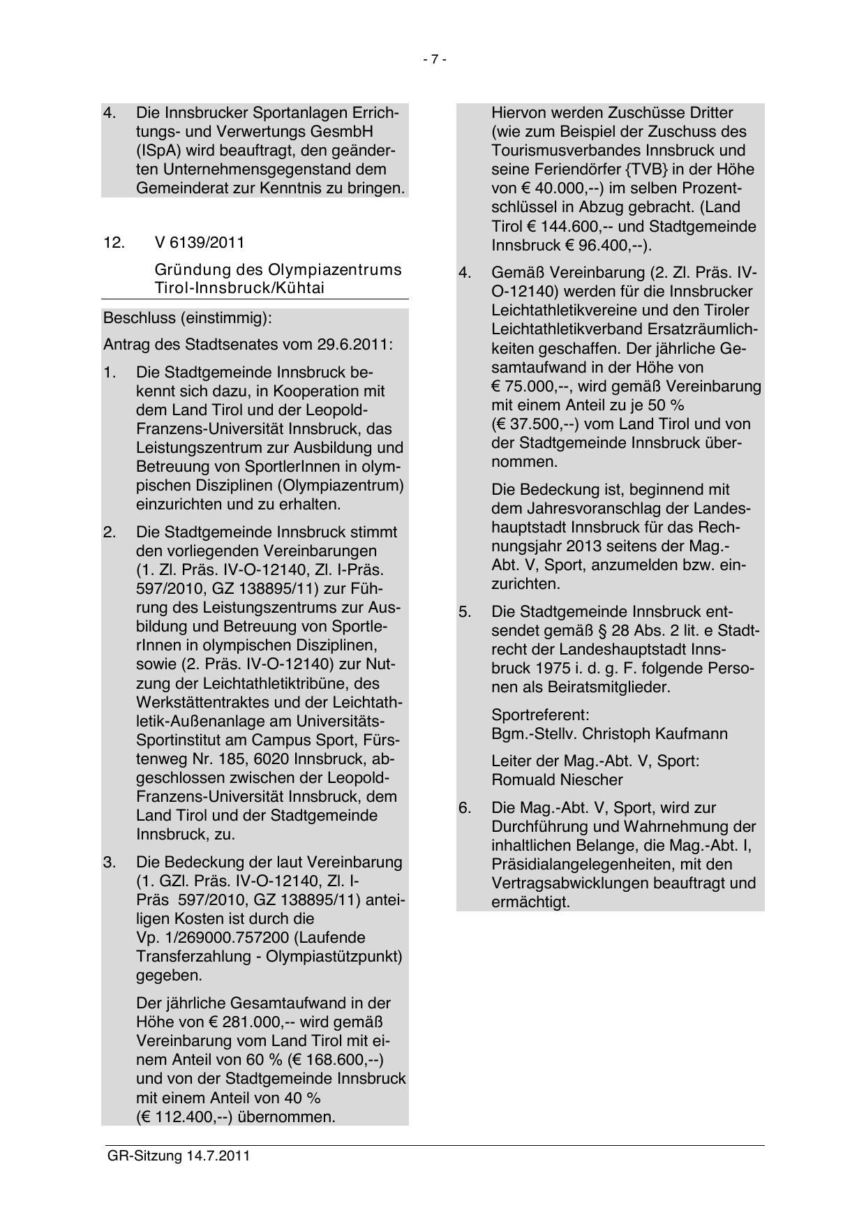 Gemäß Vereinbarung (2. Zl. Präs. IVO-12140) werden für die Innsbrucker