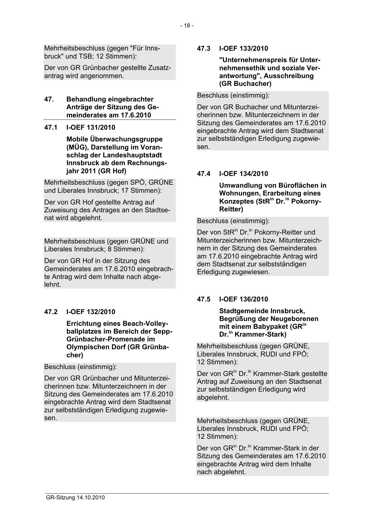 Mehrheitsbeschluss (gegen "Für Innsbruck" und TSB; 12 Stimmen):