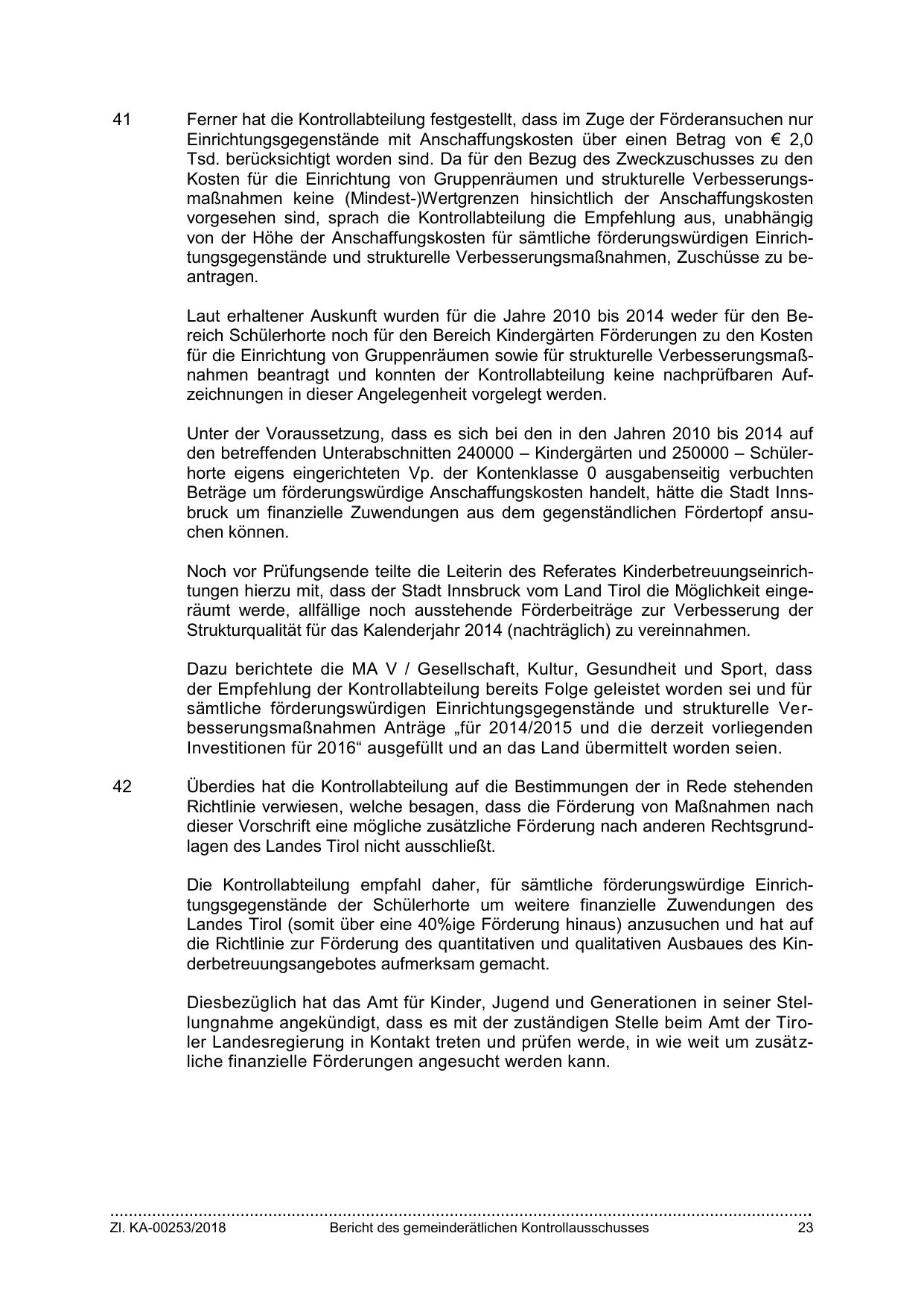 Noch vor Prüfungsende teilte die Leiterin des Referates Kinderbetreuungseinrichtungen hierzu mit, dass der Stadt Innsbruck vom Land Tirol die Möglichkeit eingeräumt werde, allfällige noch ausstehende Förderbeiträge zur Verbesserung der