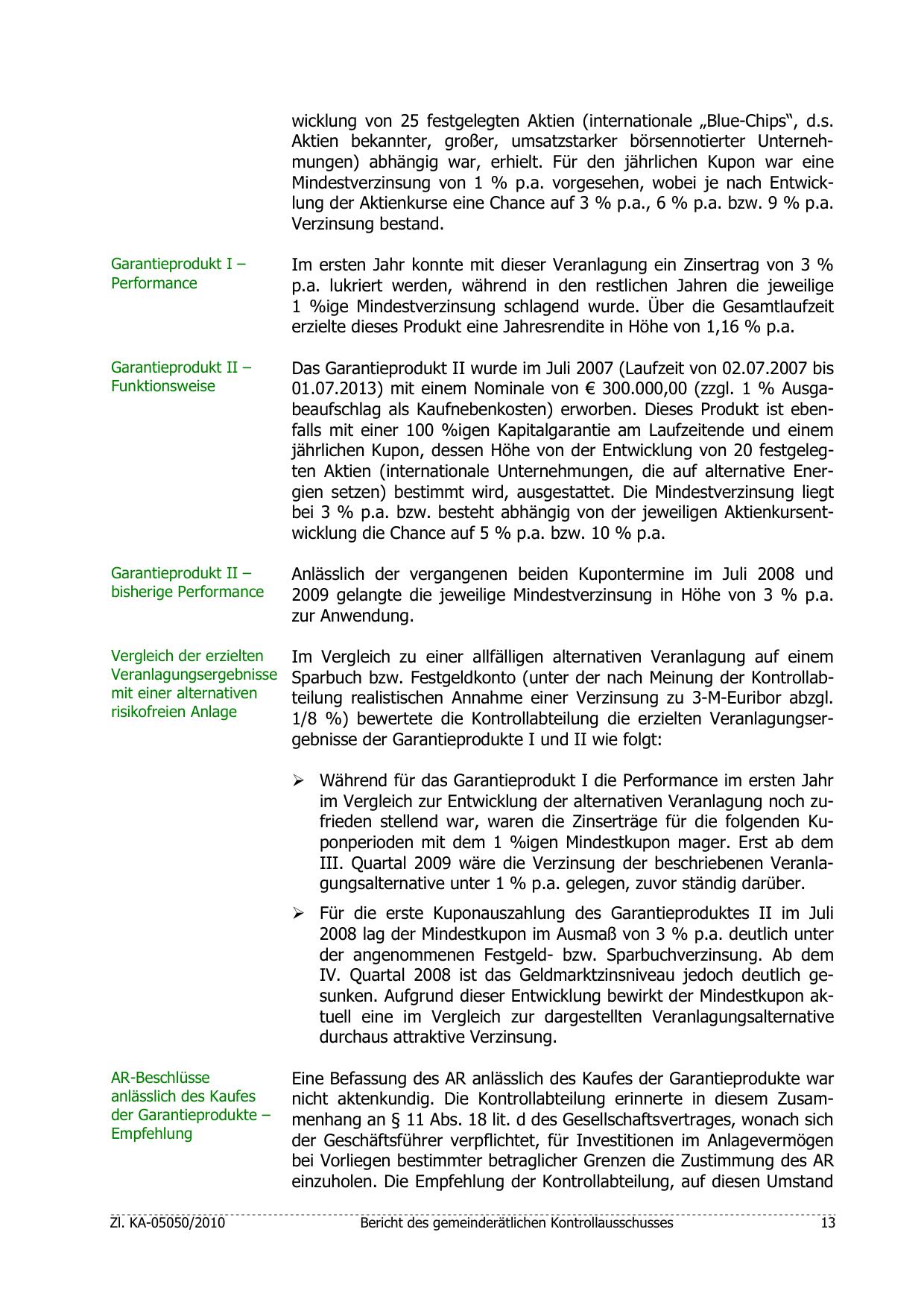 1/8 %) bewertete die Kontrollabteilung die erzielten Veranlagungsergebnisse der Garantieprodukte I und II wie folgt: