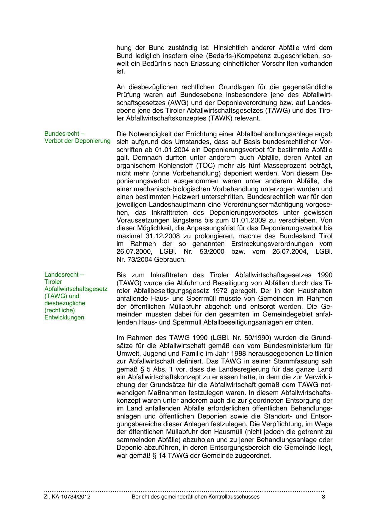 Prüfung waren auf Bundesebene insbesondere jene des Abfallwirtschaftsgesetzes (AWG) und der Deponieverordnung bzw. auf Landesebene jene des Tiroler Abfallwirtschaftsgesetzes (TAWG) und des Tiroler Abfallwirtschaftskonzeptes (TAWK) relevant.
