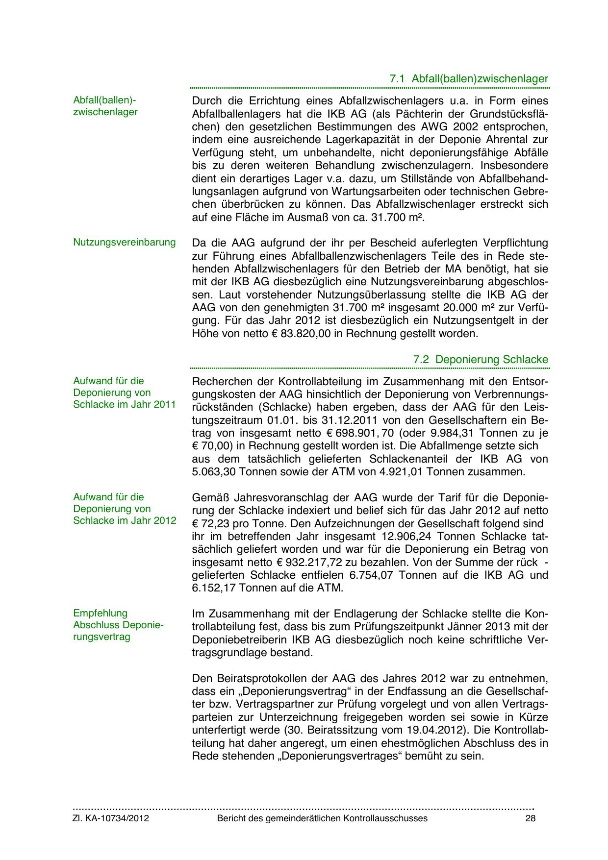 Recherchen der Kontrollabteilung im Zusammenhang mit den Entsorgungskosten der AAG hinsichtlich der Deponierung von Verbrennungsrückständen (Schlacke) haben ergeben, dass der AAG für den Leistungszeitraum 01.01. bis 31.12.2011 von den Gesellschaftern ein Betrag von insgesamt netto € 698.901, 70 (oder 9.984,31 Tonnen zu je