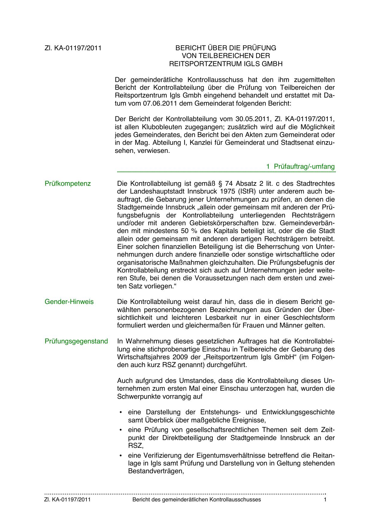 Reitsportzentrum Igls Gmbh eingehend behandelt und erstattet mit Datum vom 07.06.2011 dem Gemeinderat folgenden Bericht: