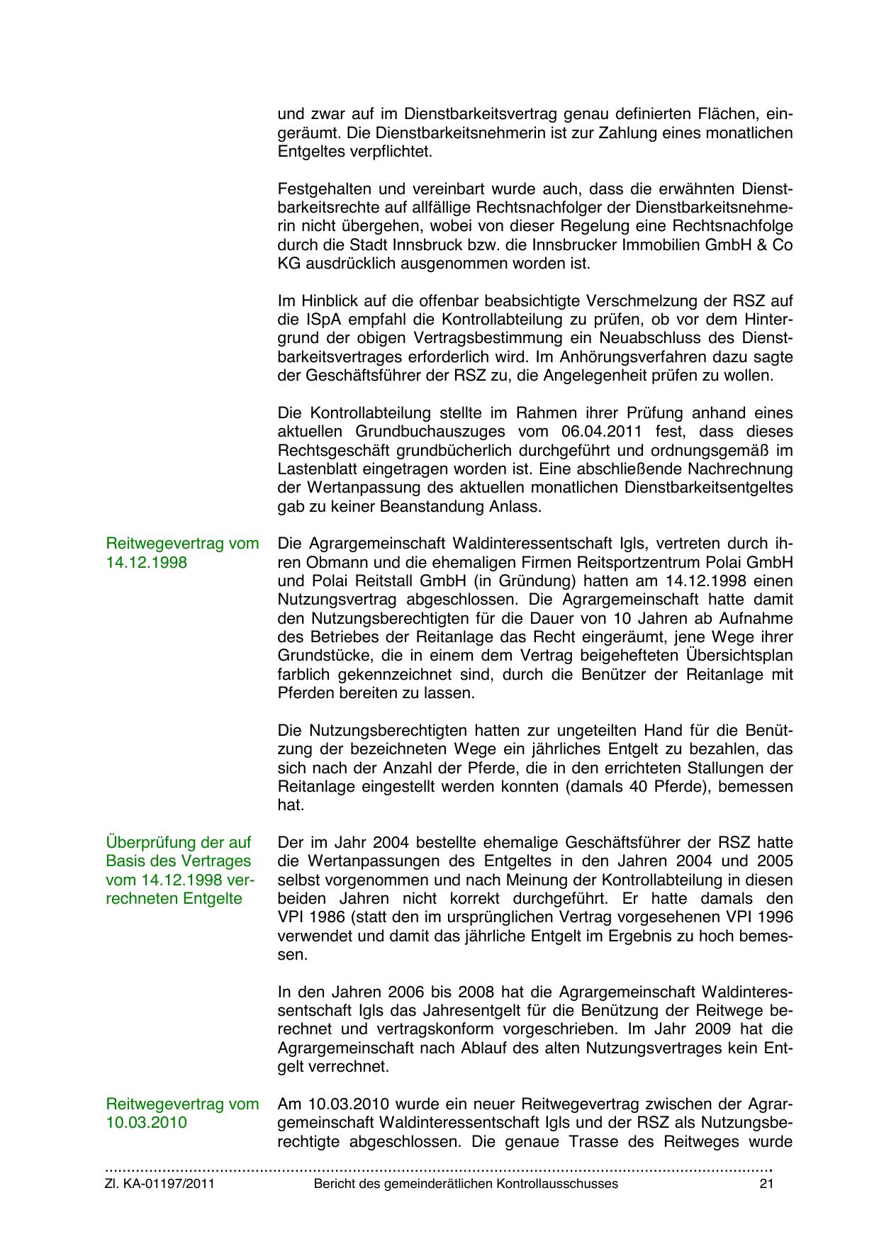 In den Jahren 2006 bis 2008 hat die Agrargemeinschaft Waldinteressentschaft Igls das Jahresentgelt für die Benützung der Reitwege berechnet und vertragskonform vorgeschrieben. Im Jahr 2009 hat die