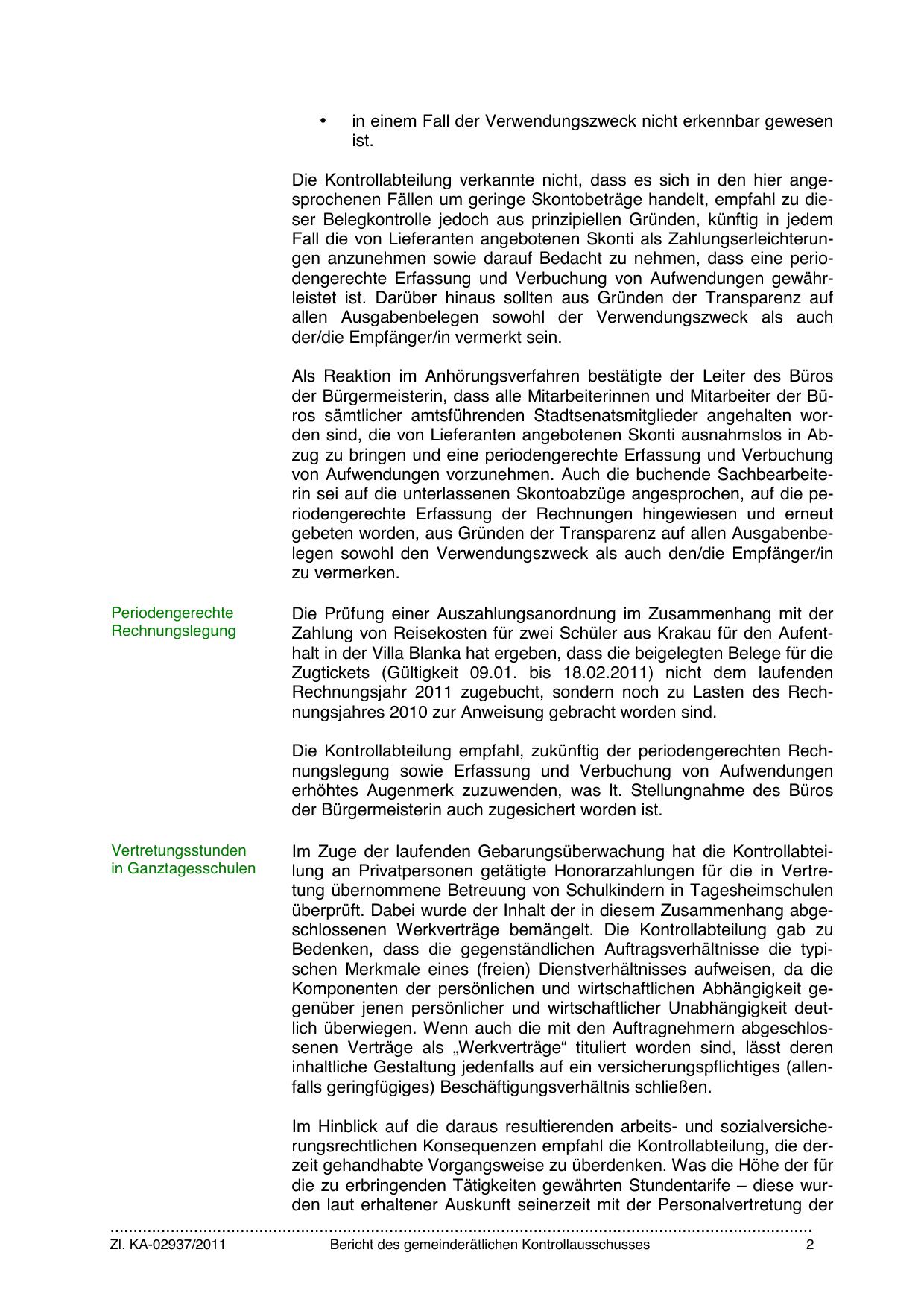 der Bürgermeisterin, dass alle Mitarbeiterinnen und Mitarbeiter der Büros sämtlicher amtsführenden Stadtsenatsmitglieder angehalten worden sind, die von Lieferanten angebotenen Skonti ausnahmslos in Abzug zu bringen und eine periodengerechte Erfassung und Verbuchung