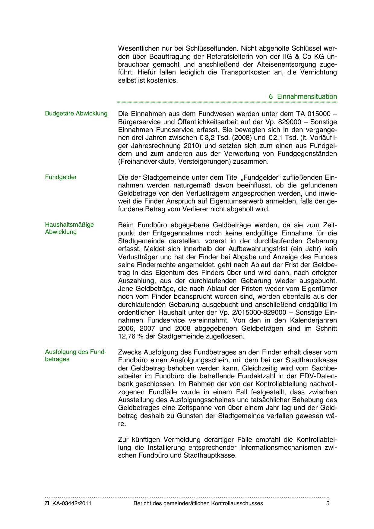 Einnahmen Fundservice erfasst. Sie bewegten sich in den vergangenen drei Jahren zwischen € 3,2 Tsd. (2008) und € 2,1 Tsd. (lt. Vorläuf iger Jahresrechnung 2010) und setzten sich zum einen aus Fundgeldern und zum anderen aus der Verwertung von Fundgegenständen