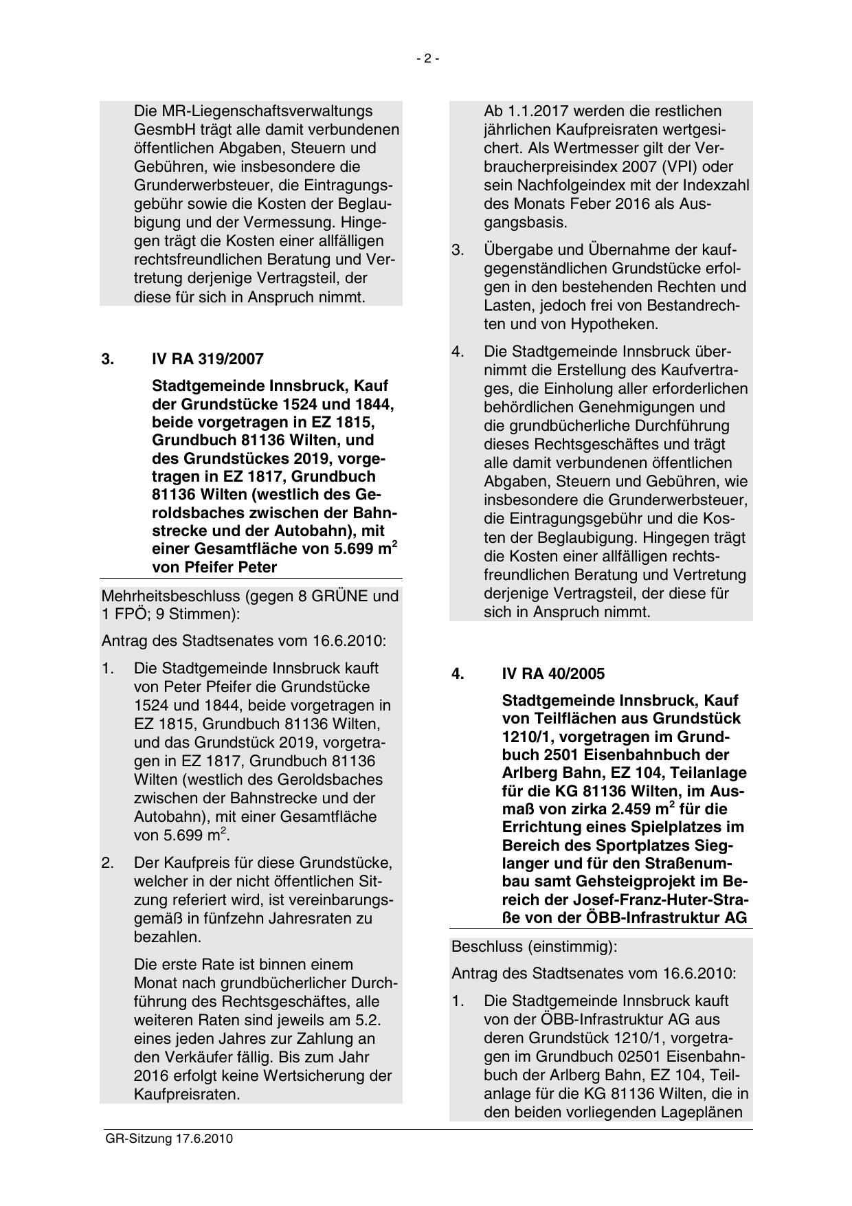 Die Stadtgemeinde Innsbruck übernimmt die Erstellung des Kaufvertrages, die Einholung aller erforderlichen