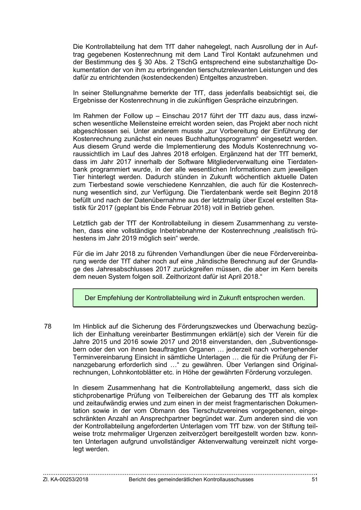 der Kontrollabteilung angeforderten Unterlagen vom TfT bzw. von der Stiftung teilweise trotz mehrmaliger Urgenzen zeitverzögert bereitgestellt worden bzw. konnten Unterlagen aufgrund unvollständiger Aktenverwaltung vereinzelt nicht vorgelegt werden.