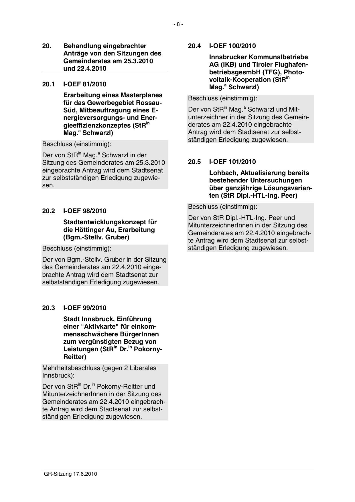 Der von StRin Mag.a Schwarzl und Mitunterzeichner in der Sitzung des Gemeinderates am 22.4.2010 eingebrachte