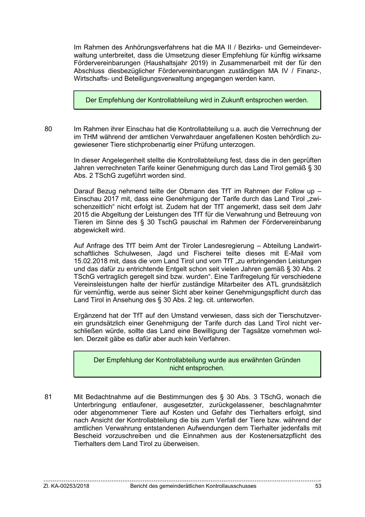 Ergänzend hat der TfT auf den Umstand verwiesen, dass sich der Tierschutzverein grundsätzlich einer Genehmigung der Tarife durch das Land Tirol nicht verschließen würde, sollte das Land eine Bewilligung der Tagsätze vornehmen wollen. Derzeit gäbe es dafür aber auch kein Verfahren.