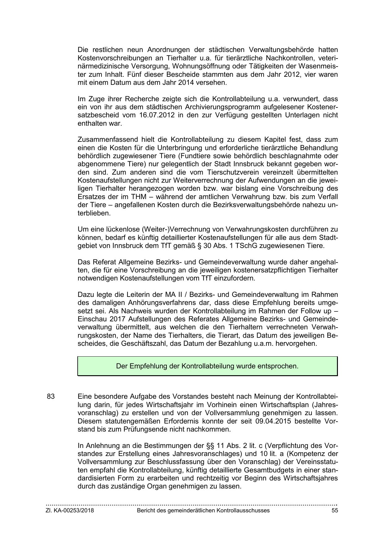 können, bedarf es künftig detaillierter Kostenaufstellungen für alle aus dem Stadtgebiet von Innsbruck dem TfT gemäß § 30 Abs. 1 TSchG zugewiesenen Tiere.