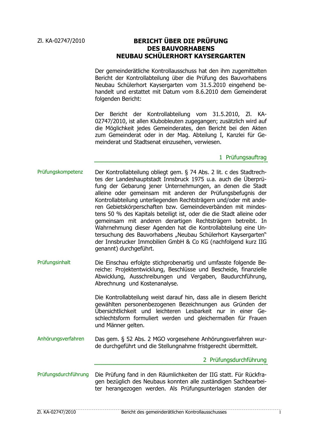 Wahrnehmung dieser Agenden hat die Kontrollabteilung eine Untersuchung des Bauvorhabens „Neubau Schülerhort Kaysergarten“
