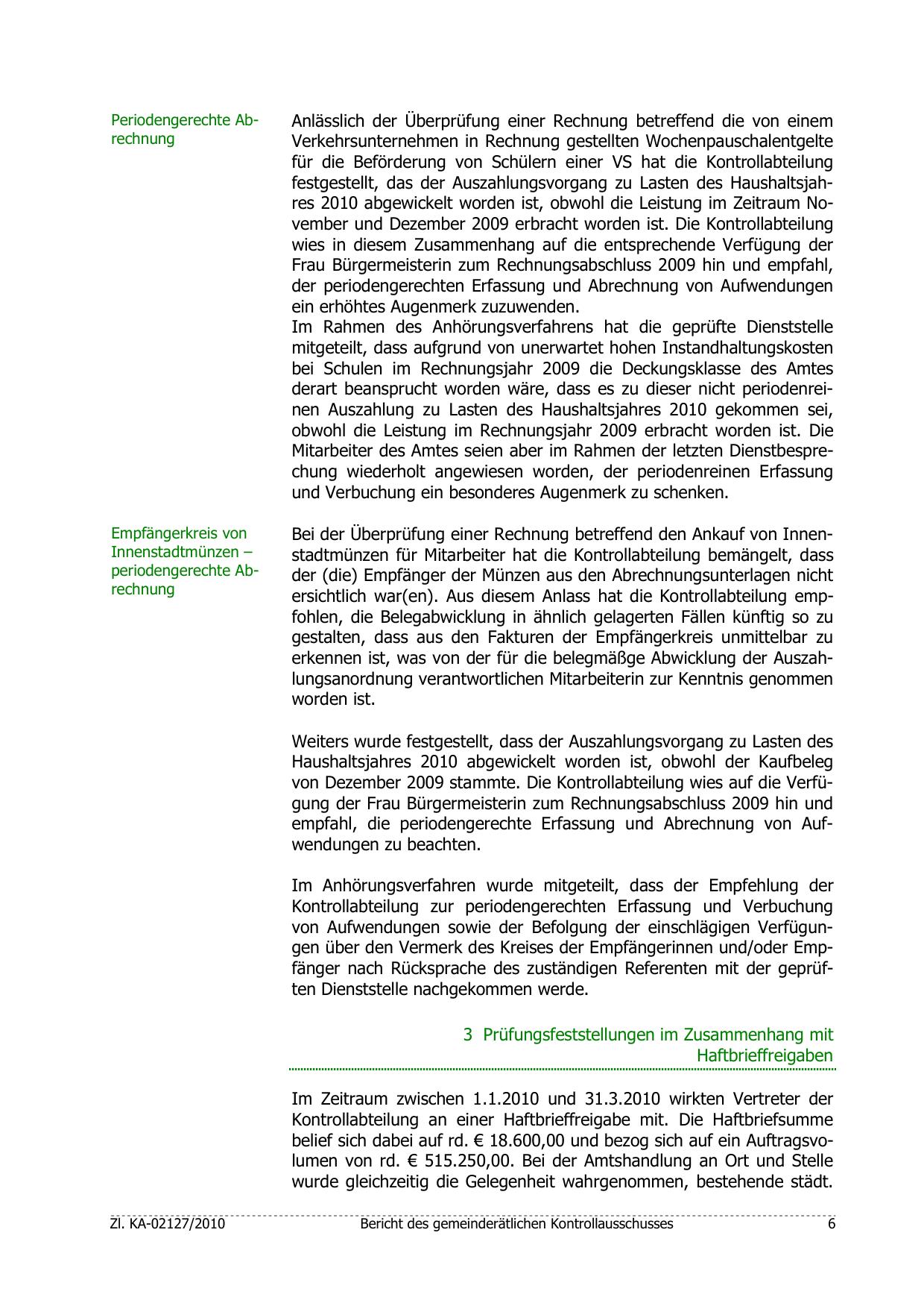 von Dezember 2009 stammte. Die Kontrollabteilung wies auf die Verfügung der Frau Bürgermeisterin zum Rechnungsabschluss 2009 hin und