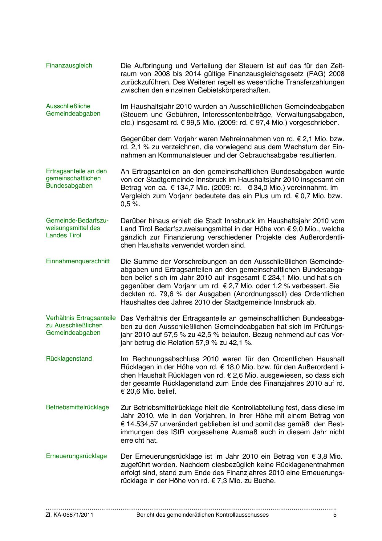 Haushaltes des Jahres 2010 der Stadtgemeinde Innsbruck ab.