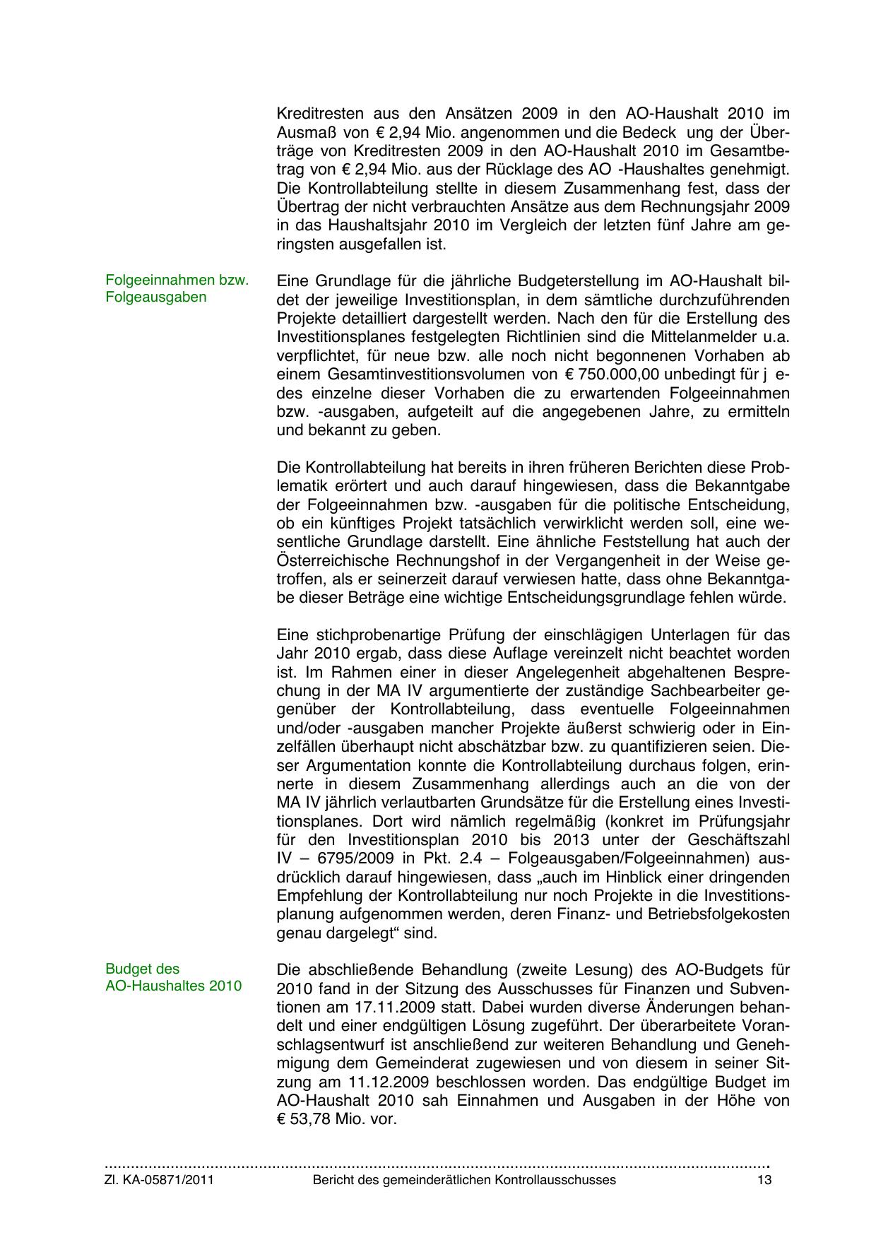 Ausmaß von € 2,94 Mio. angenommen und die Bedeck ung der Überträge von Kreditresten 2009 in den AO-Haushalt 2010 im Gesamtbetrag von € 2,94 Mio. aus der Rücklage des AO -Haushaltes genehmigt.