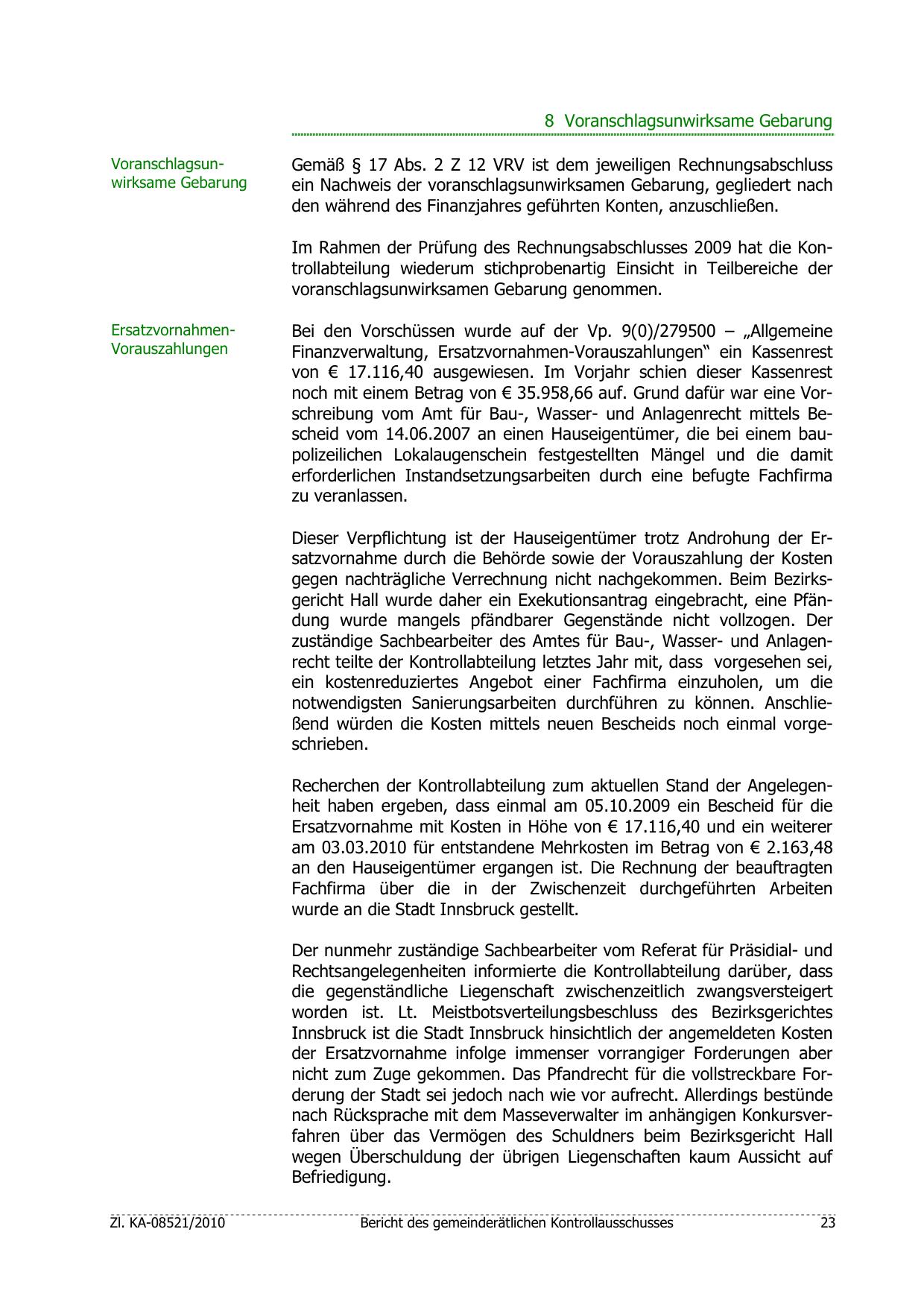 noch mit einem Betrag von € 35.958,66 auf. Grund dafür war eine Vorschreibung vom Amt für Bau-, Wasser- und Anlagenrecht mittels Bescheid vom 14.06.2007 an einen Hauseigentümer, die bei einem baupolizeilichen Lokalaugenschein festgestellten Mängel und die damit