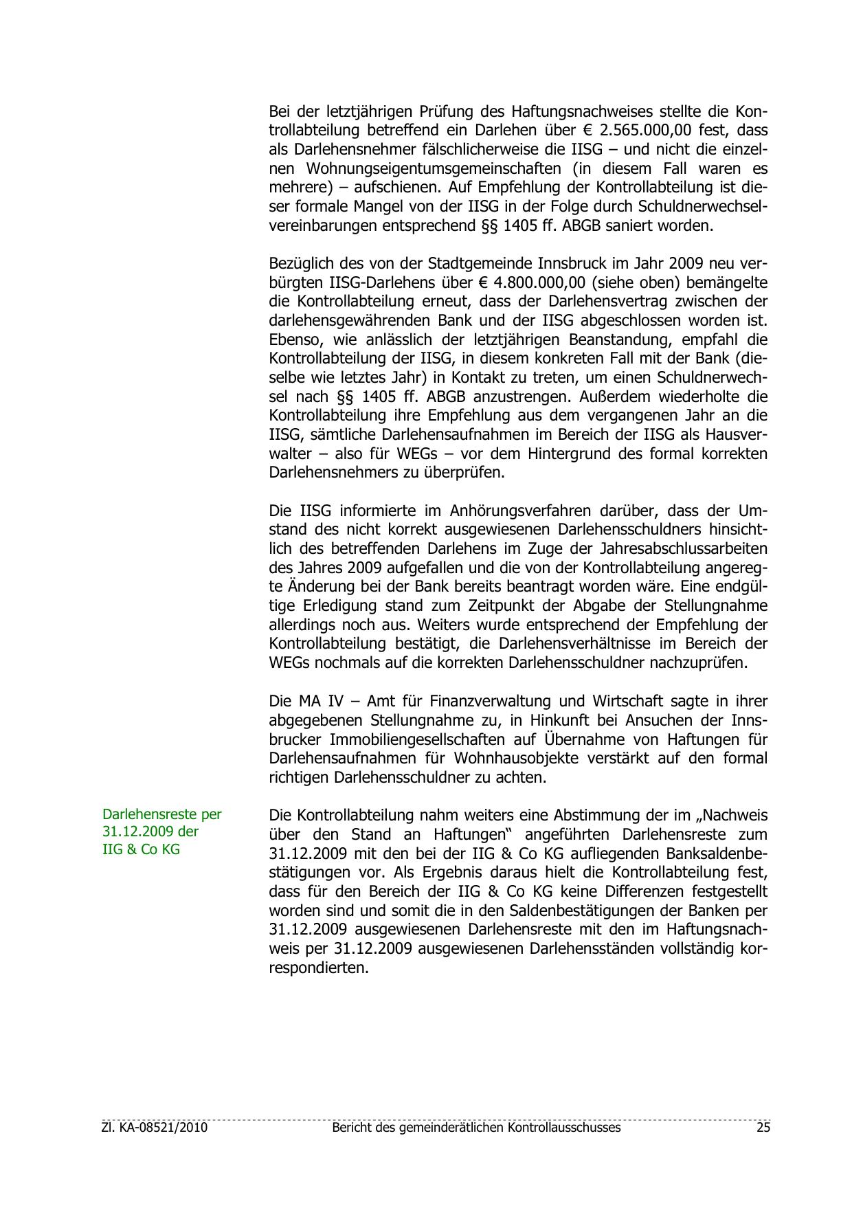Bezüglich des von der Stadtgemeinde Innsbruck im Jahr 2009 neu verbürgten IISG-Darlehens über € 4.800.000,00 (siehe oben) bemängelte