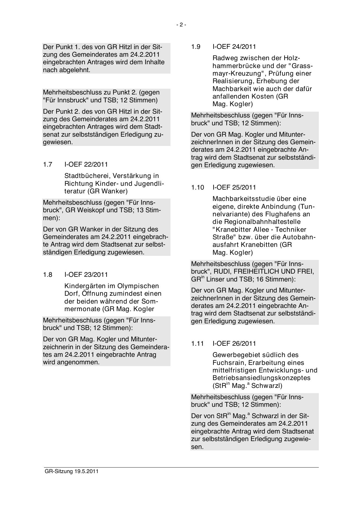 Mehrheitsbeschluss (gegen "Für Innsbruck" und TSB; 12 Stimmen):