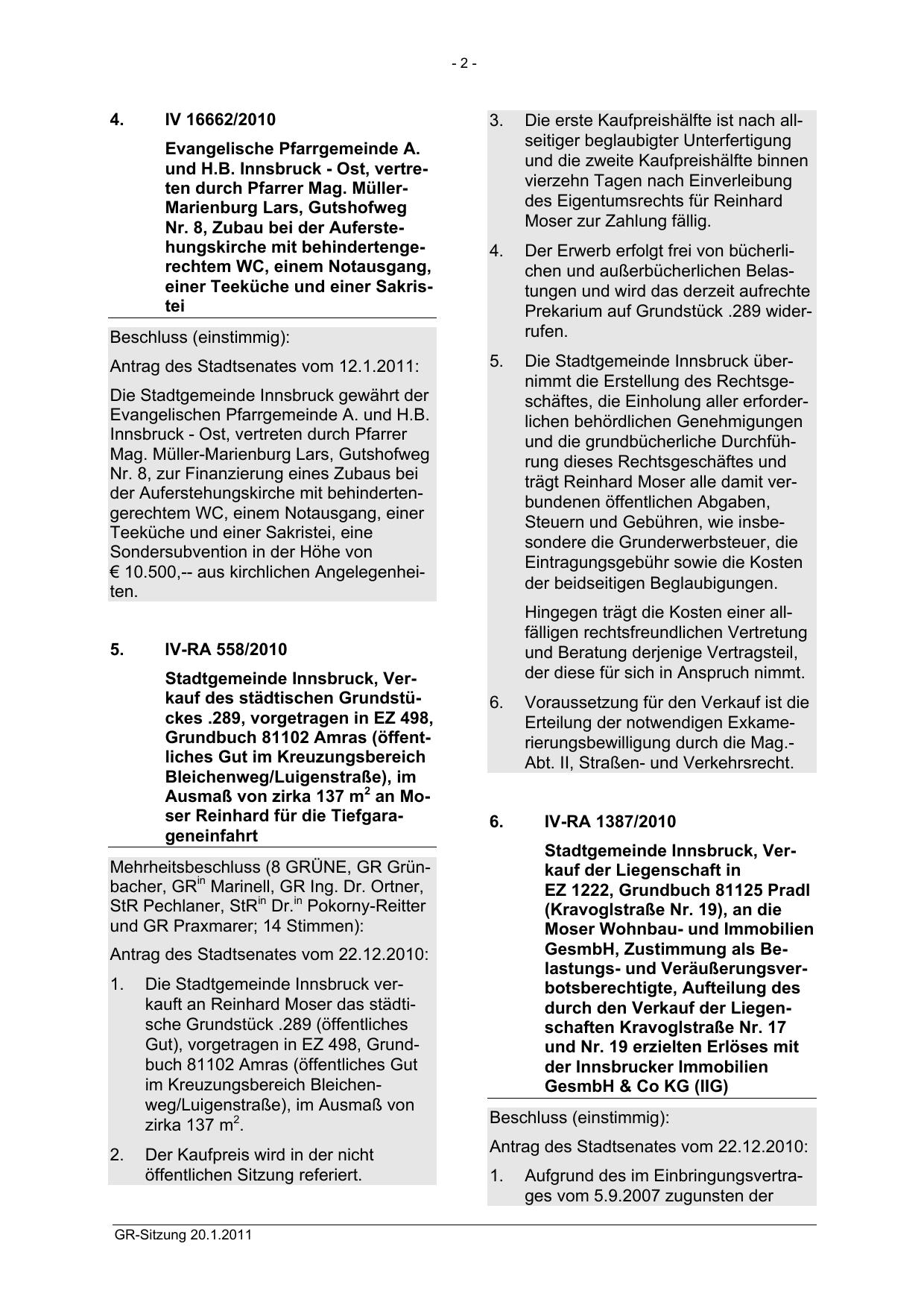 Die Stadtgemeinde Innsbruck verkauft an Reinhard Moser das städtische Grundstück .289 (öffentliches