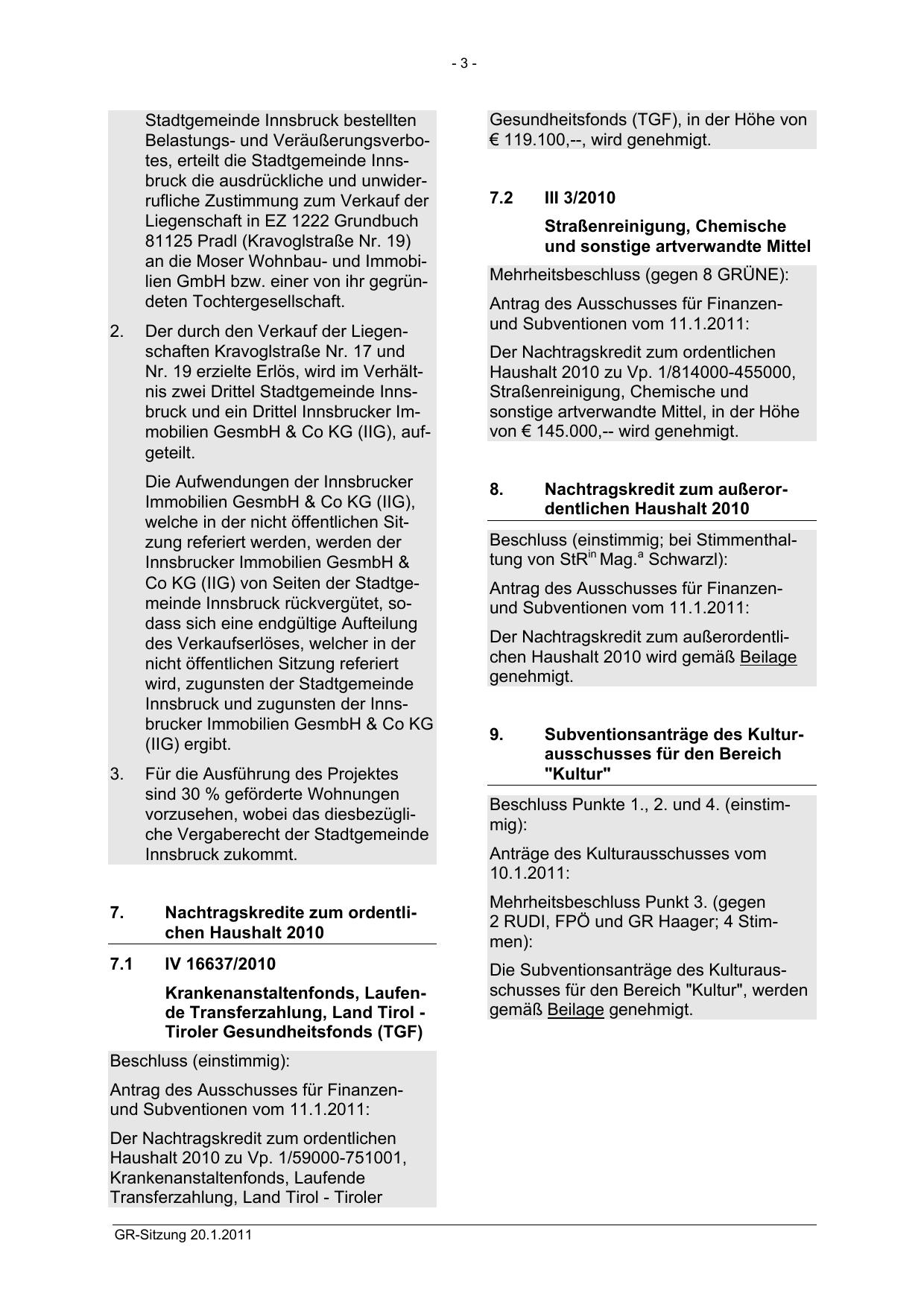 Nr. 19 erzielte Erlös, wird im Verhältnis zwei Drittel Stadtgemeinde Innsbruck und ein Drittel Innsbrucker Immobilien GesmbH & Co KG (IIG), aufgeteilt.