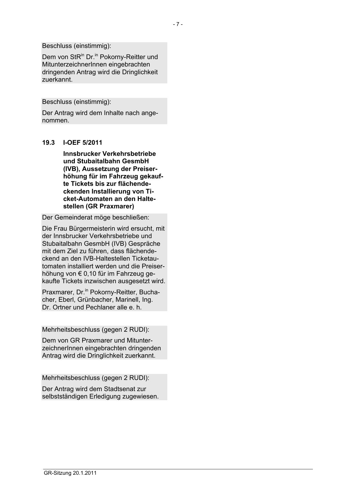 mit dem Ziel zu führen, dass flächendeckend an den IVB-Haltestellen Ticketautomaten installiert werden und die Preiserhöhung von € 0,10 für im Fahrzeug gekaufte Tickets inzwischen ausgesetzt wird.