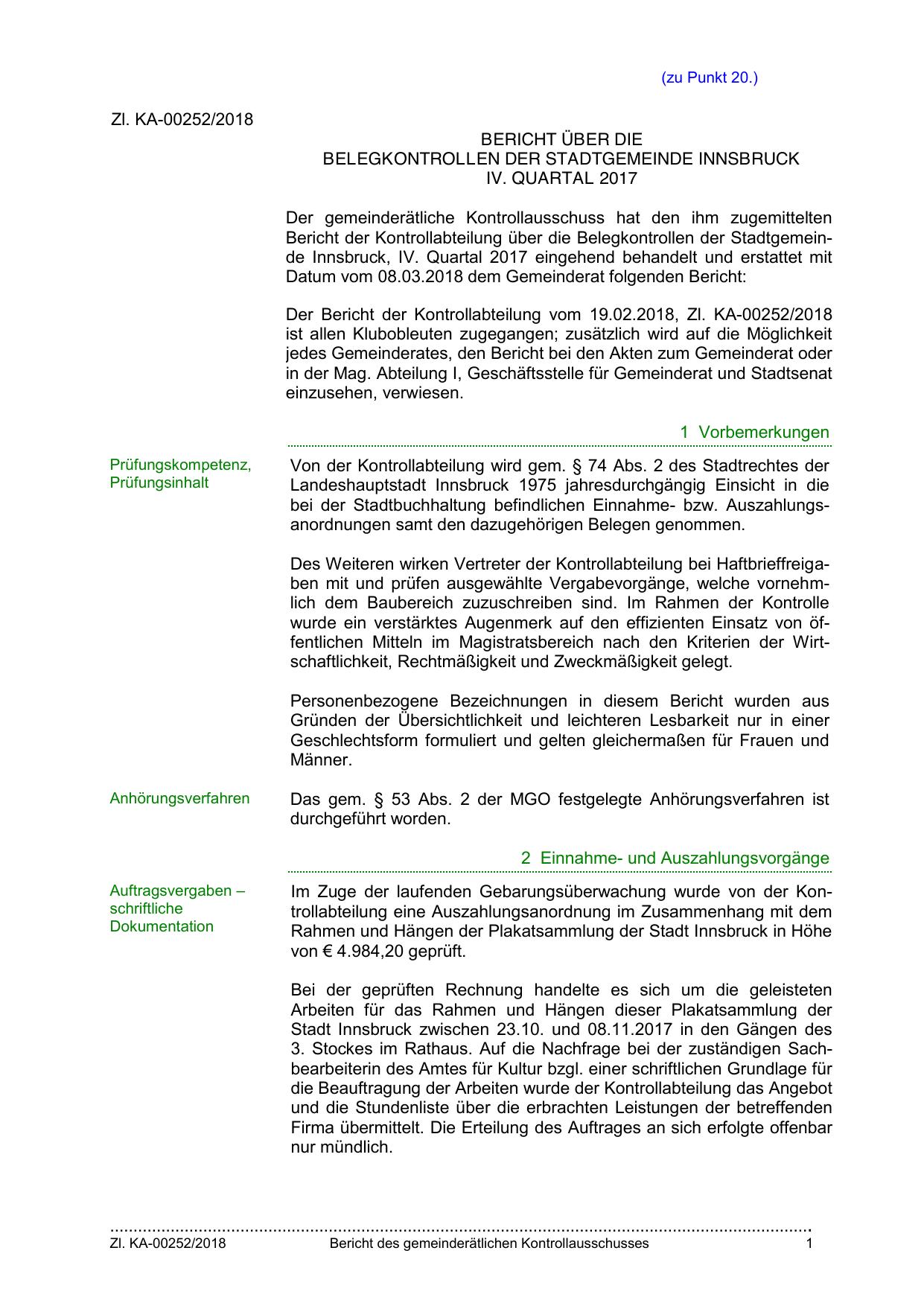 Bericht der Kontrollabteilung über die Belegkontrollen der Stadtgemeinde Innsbruck, IV. Quartal 2017 eingehend behandelt und erstattet mit