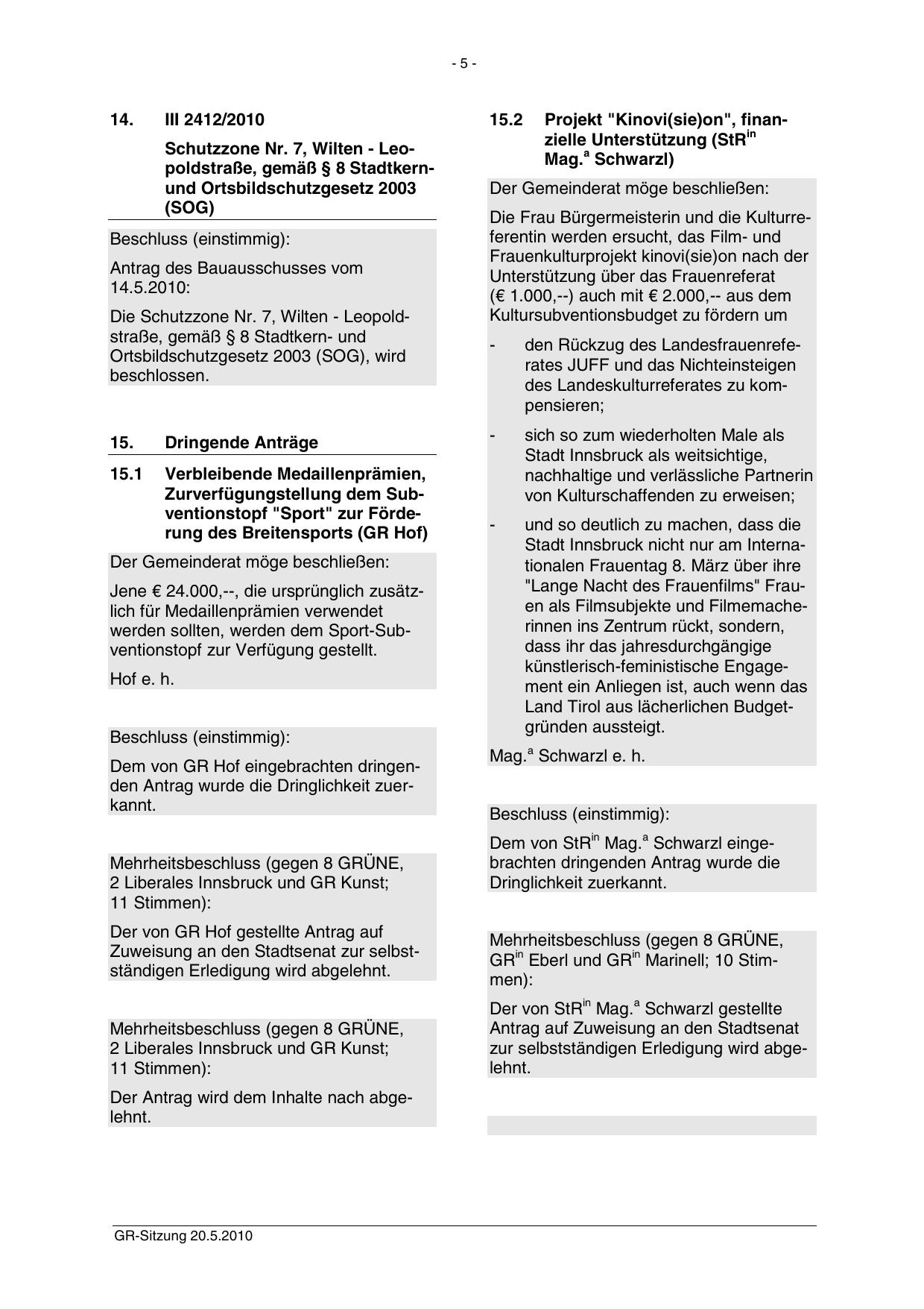 GRin Eberl und GRin Marinell; 10 Stimmen):