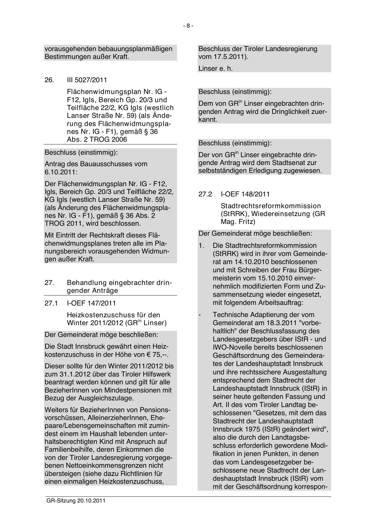 das vom Landesgesetzgeber beschlossene neue Stadtrecht der Landeshauptstadt Innsbruck (IStR) vom